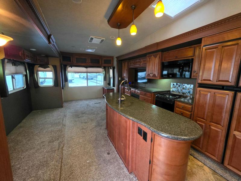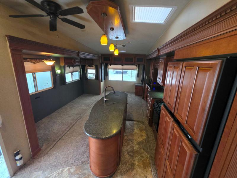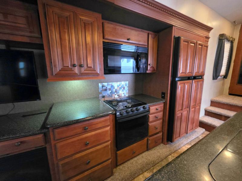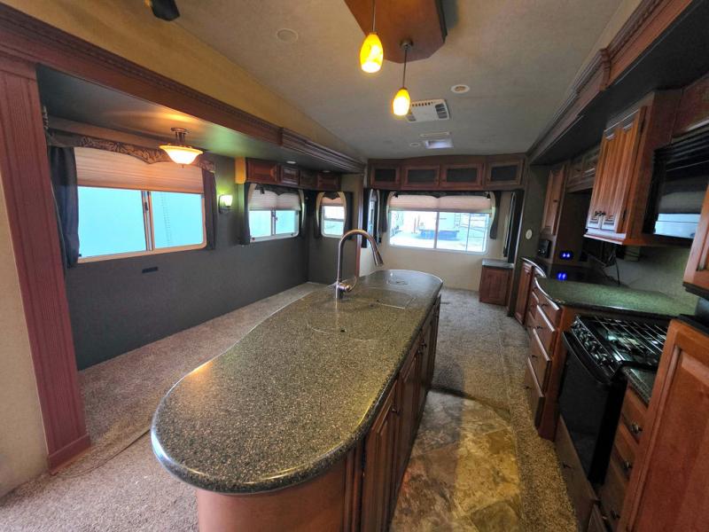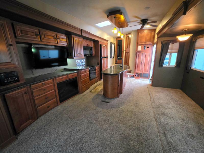 As you step into this fifth wheel, there is wide open floor space with two slide outs opposite each other in the living/kitchen area. Immediately to the right is a coat closet. To the left of entry, a slide provides a free standing dinette with four chairs, two swivel chairs and overhead cabinets.