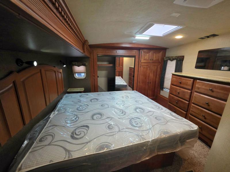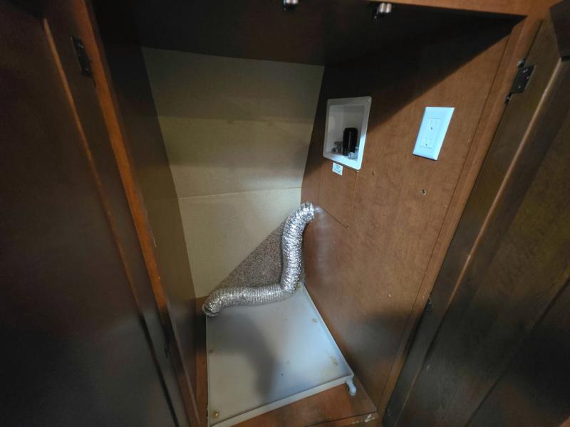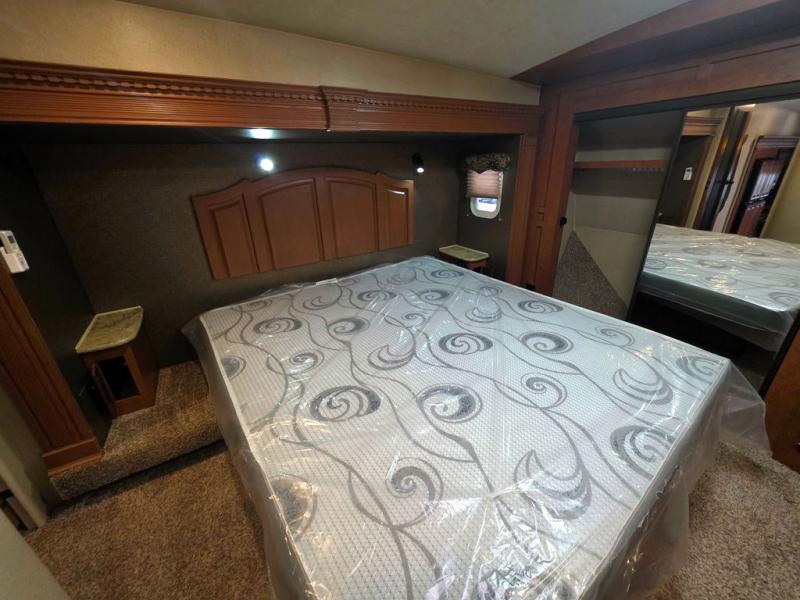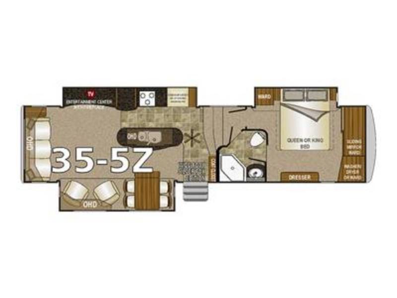 The front private bedroom includes a slide with a wardrobe, a queen bed and nightstands. You may choose an optional king size bed. There is a dresser on the wall opposite the bed. Along the front wall is a sliding mirror wardrobe and a washer/dryer closet or wardrobe in the corner.