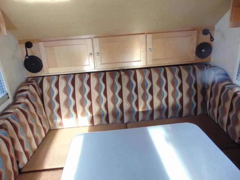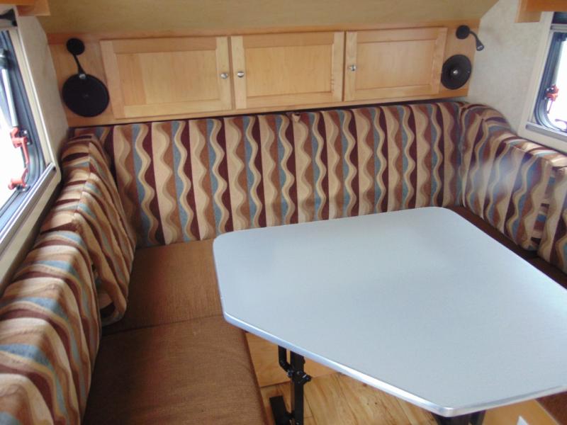 There is plenty of seating with the u-shaped dinette featuring storage beneath all of the benches, as well as along the back wall up above. When nightfall comes, you can easily fold down the table and create a 70" x 76" sleeping space for two. There might even be room for the family dog!