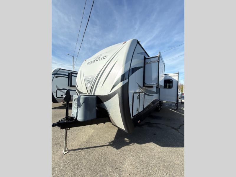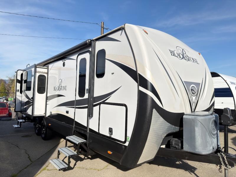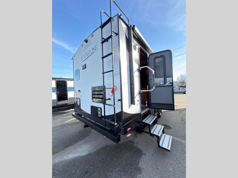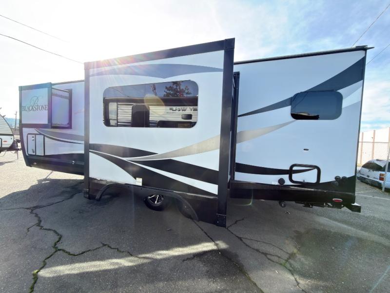 Outdoors RV offers the Black Stone 240RKSB travel trailer with triple slides, dual entry, and a rear kitchen.
