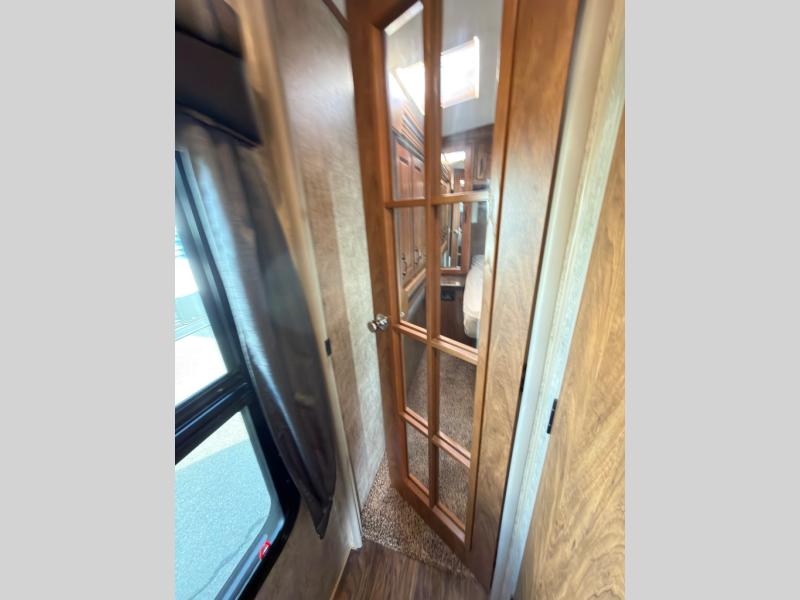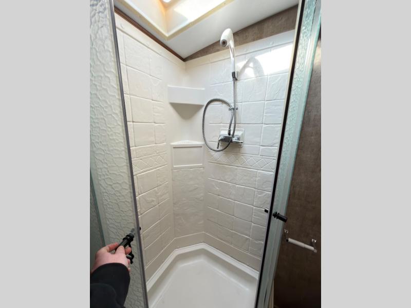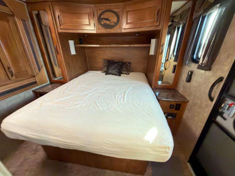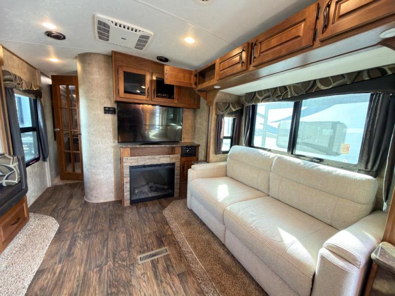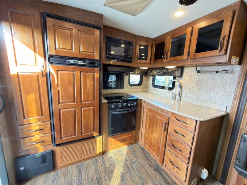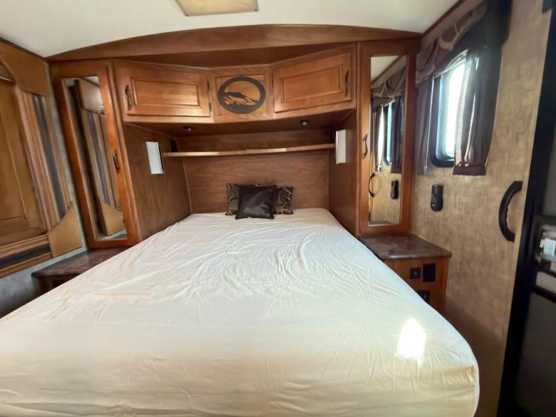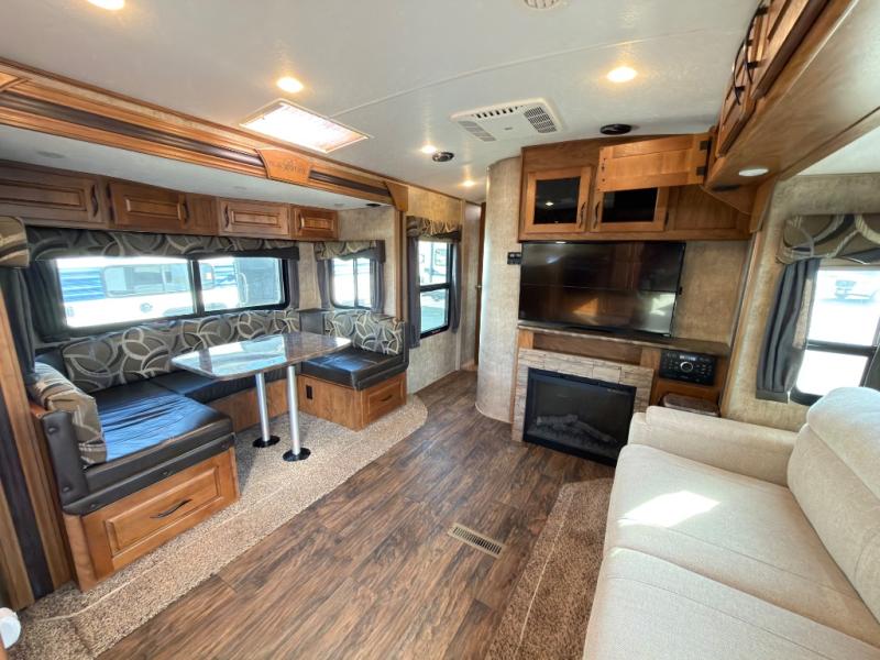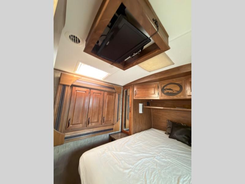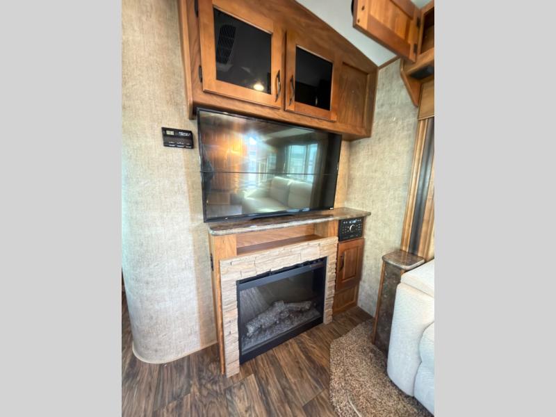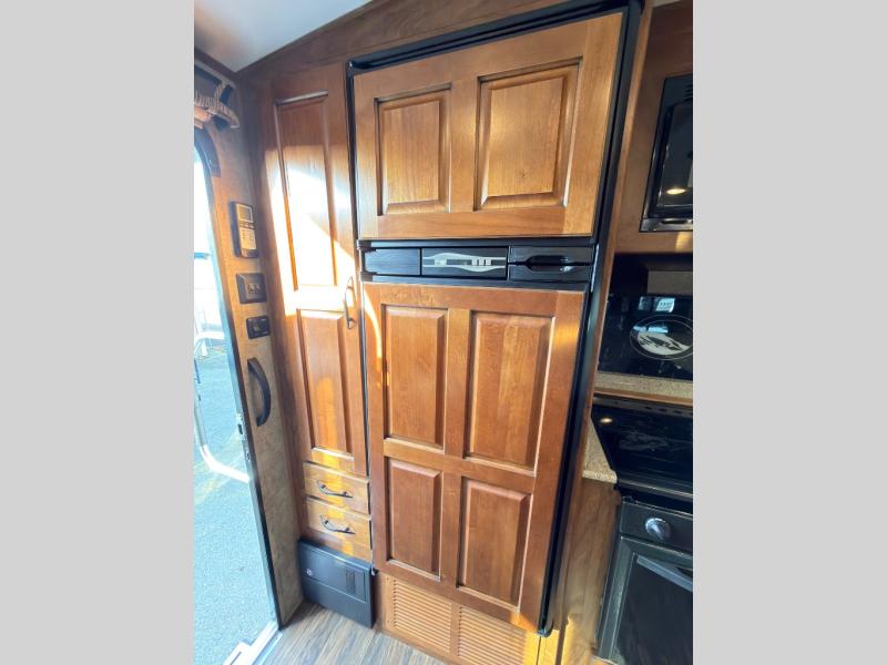 On the opposite side there is a second slide with a sleeper sofa and more overhead cabinets which really opens up the interior floor space. Or in place of the sofa you may choose to have optional lounge recliners. The interior wall, next to the sofa, includes an entertainment center and fireplace along with a 42" LED TV.