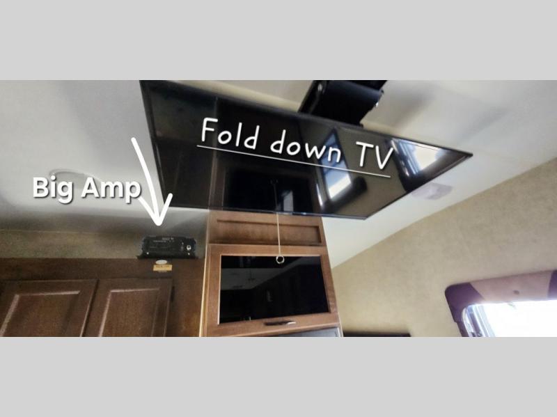 The cargo space is 12'8" on the road side, and 16'10" on the curb side which allows you to take quite a few things along. Notice the drop down electric bed for sleeping that neatly stores up to the tall ceiling when not in use. There are also dual sofas opposite one another including overhead cabinets that provide ample seating and can also be used for sleeping space at night if needed. You can even choose to have the road side sofa on an optional slide out.