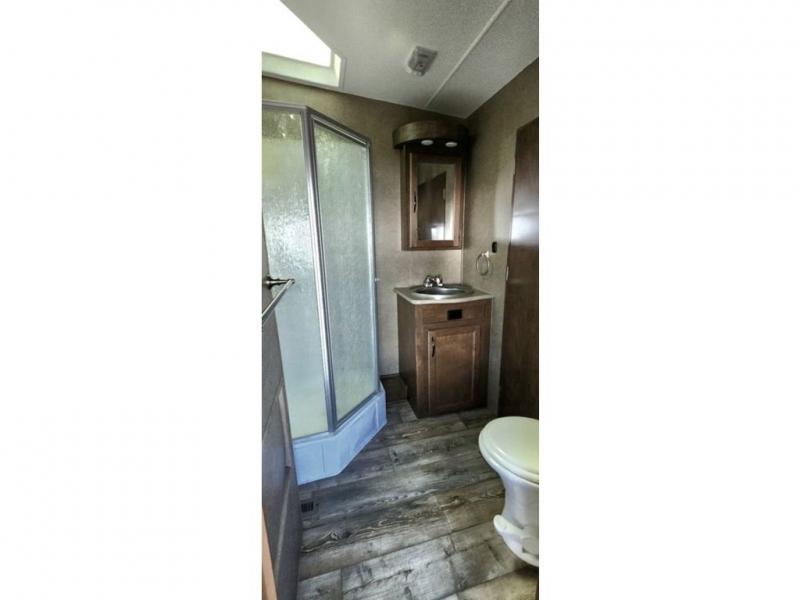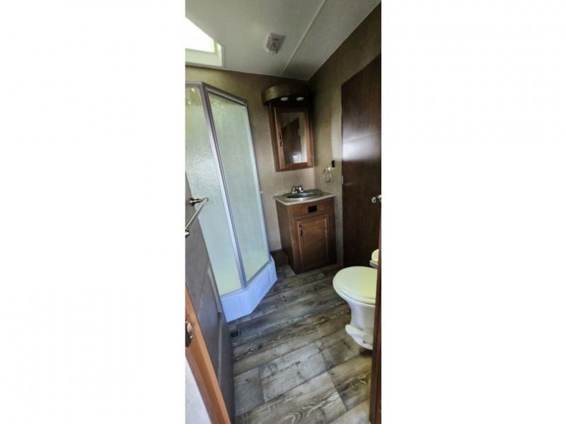 A complete side aisle bath offers an angled shower, toilet, sink and also features a second entry door that leads right into the front private bedroom where you will find a queen size bed and dual bedside wardrobes, plus overhead cabinets, and so much more!