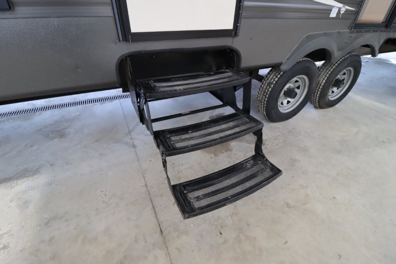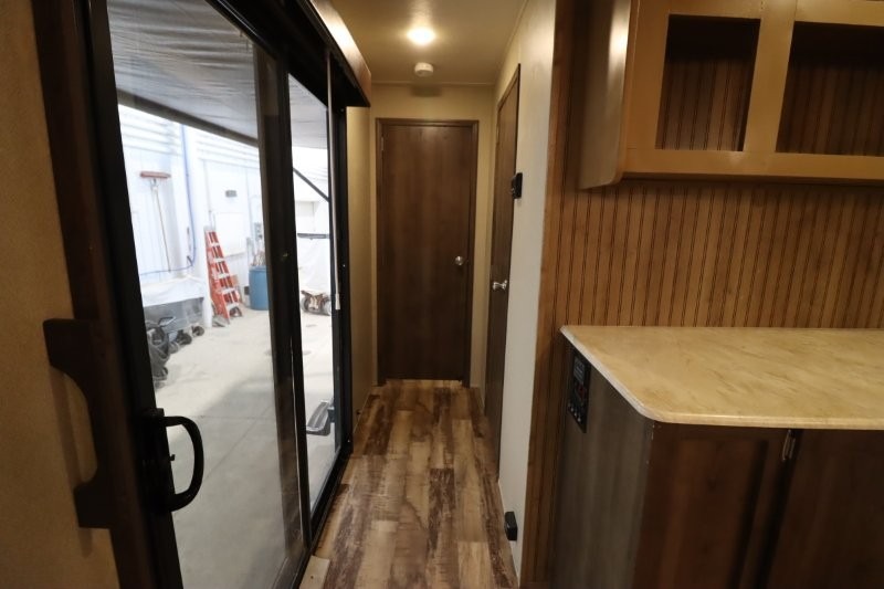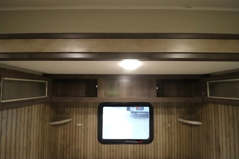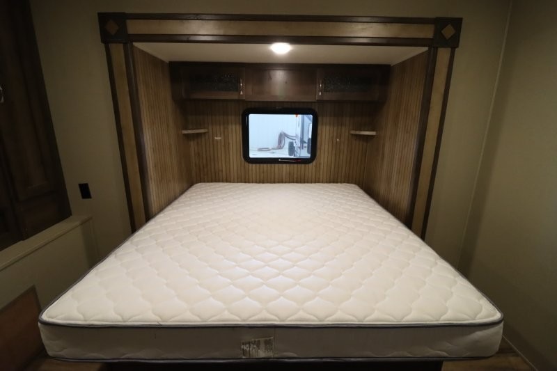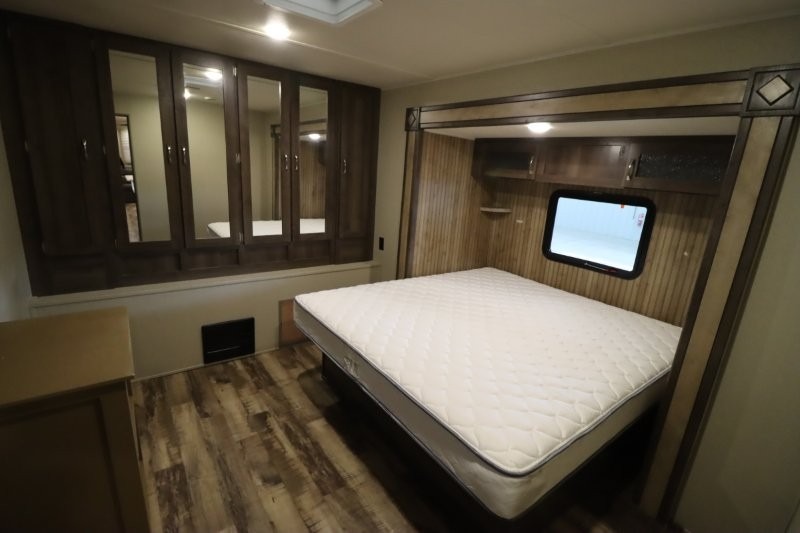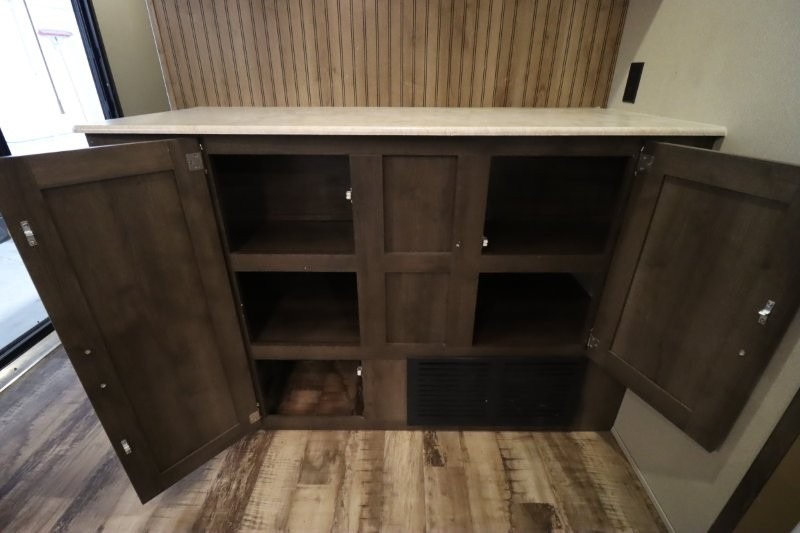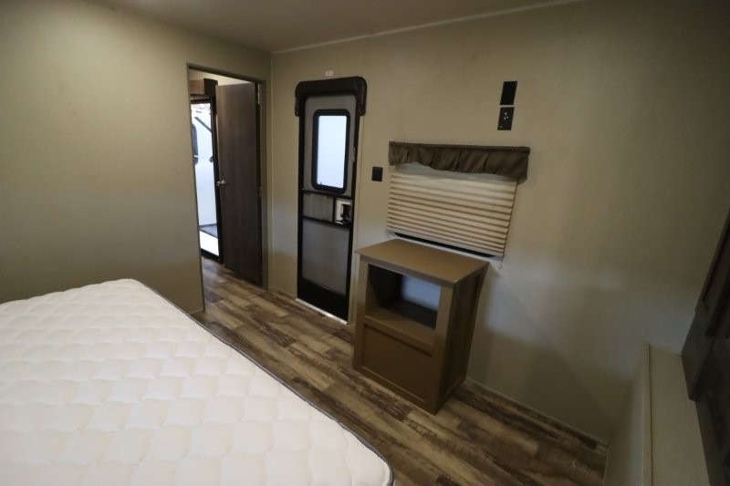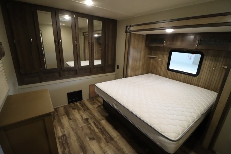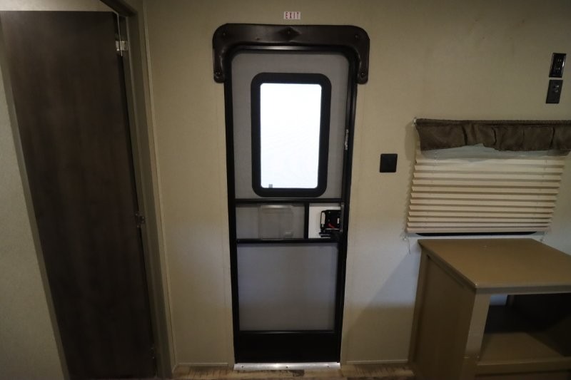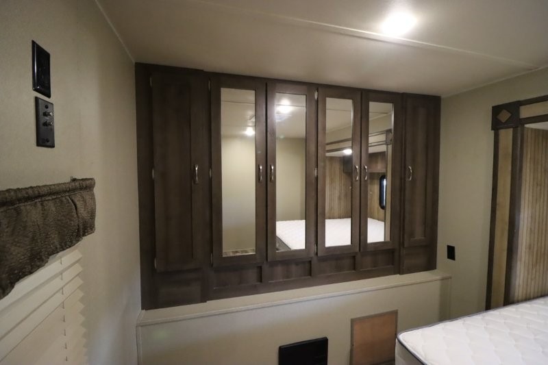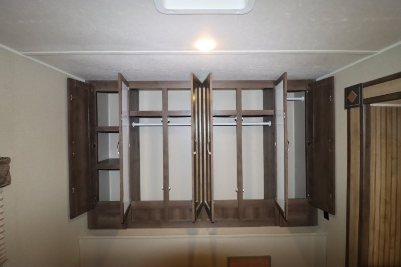 The rear private master bedroom features a slide out king bed with overhead storage and shelves, a dresser, and a wardrobe, linen cabinet, and an additional smaller wardrobe with optional washer/dryer prep along the rear wall. The second entry/exit into the trailer comes in handy if you need to get in quickly to change clothes or relax or a while.
