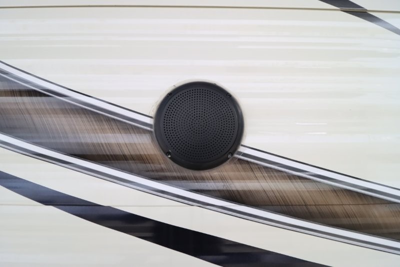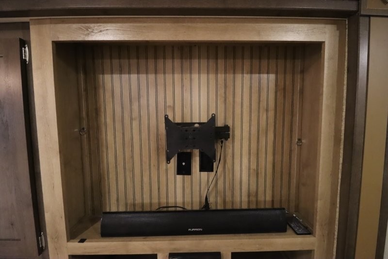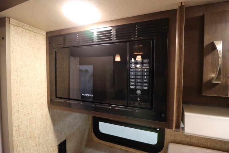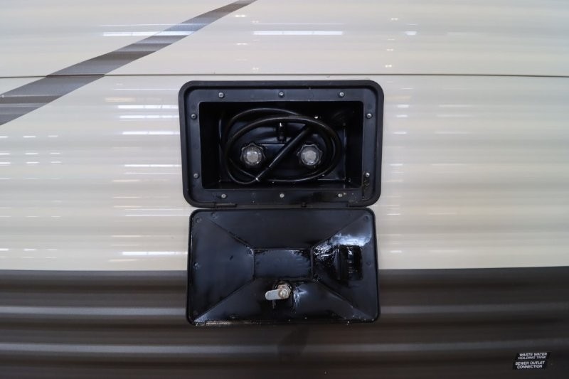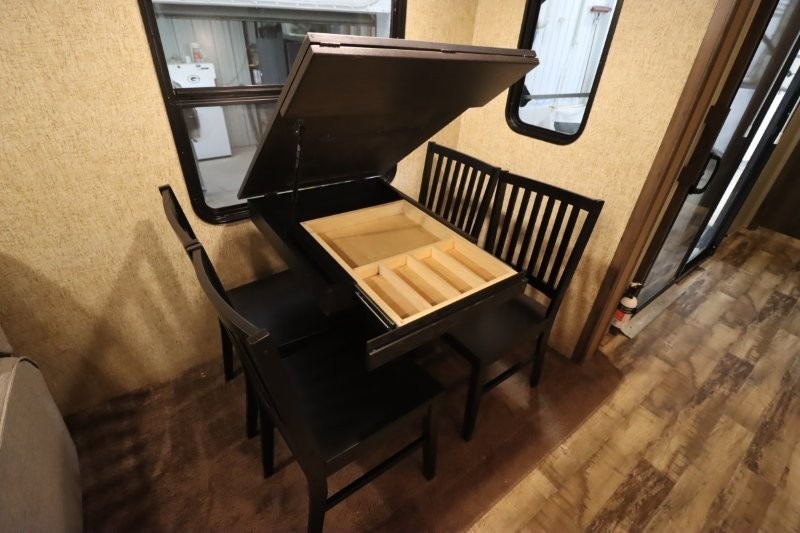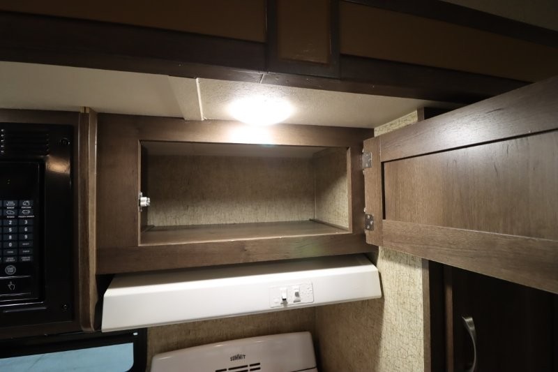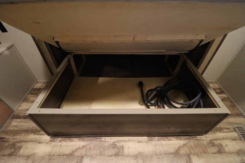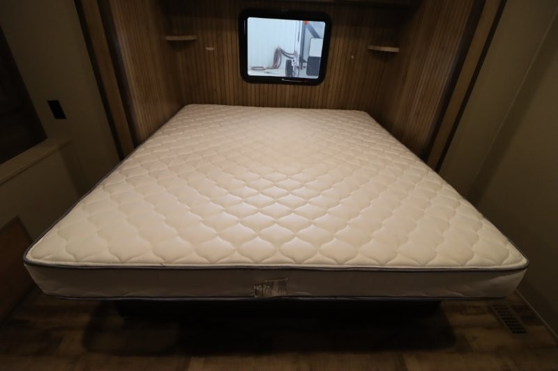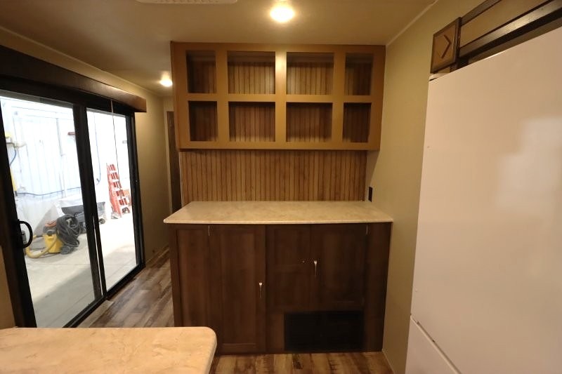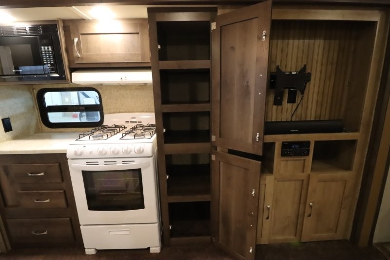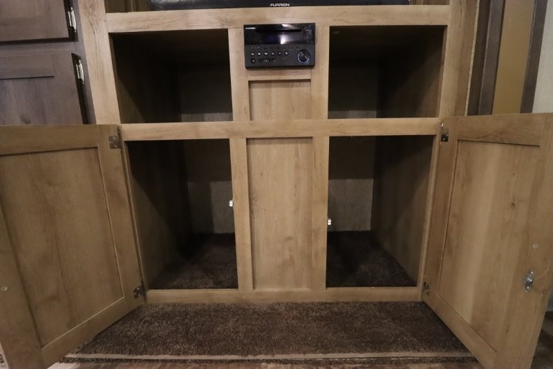The rear private master bedroom features a slide out king bed with overhead storage and shelves, a dresser, and a wardrobe, linen cabinet, and an additional smaller wardrobe with optional washer/dryer prep along the rear wall. The second entry/exit into the trailer comes in handy if you need to get in quickly to change clothes or relax or a while.