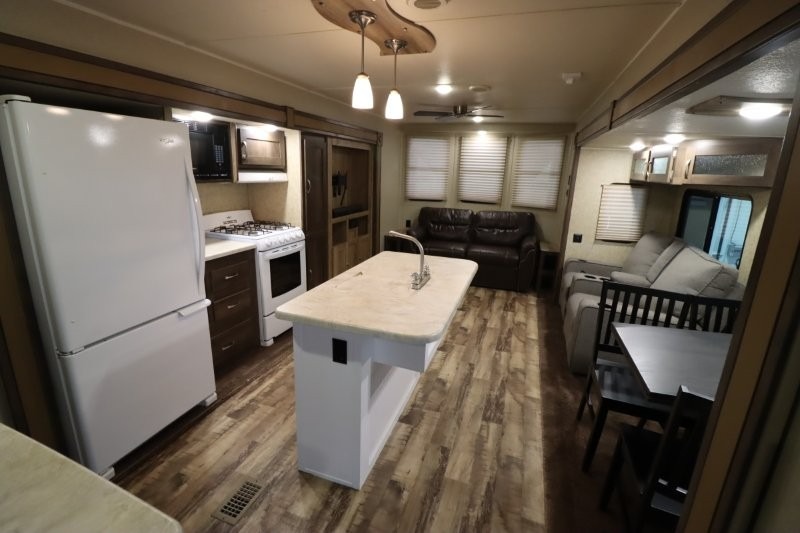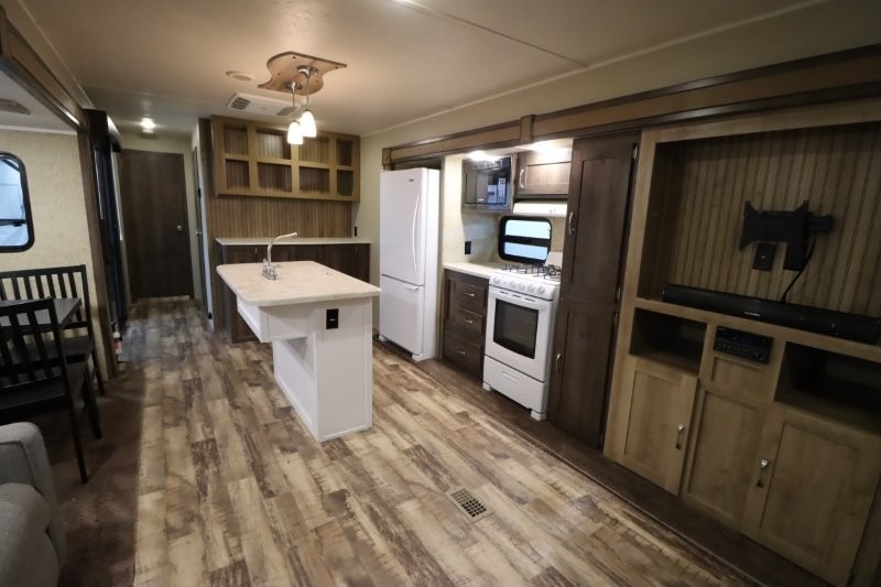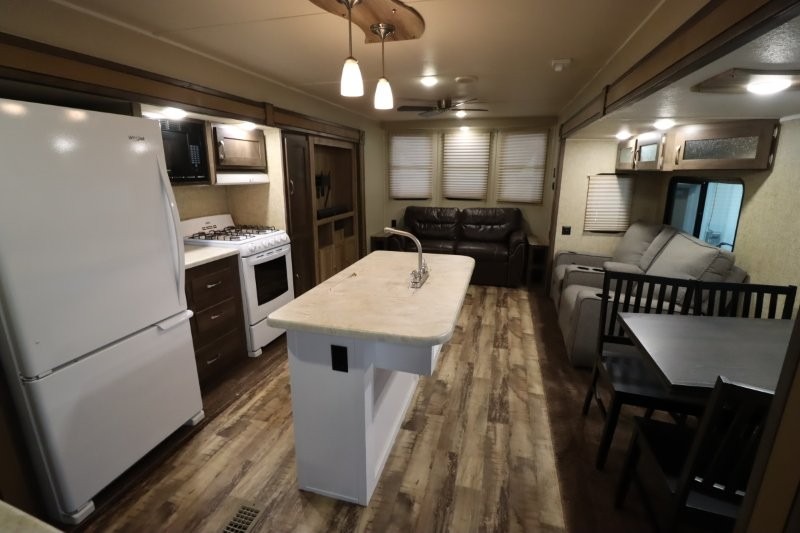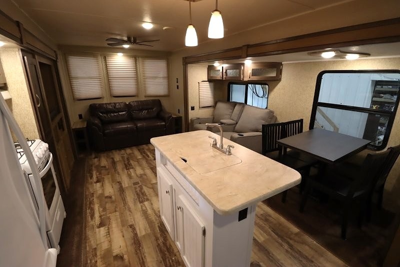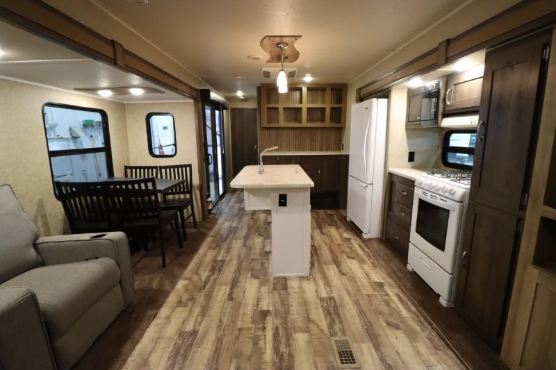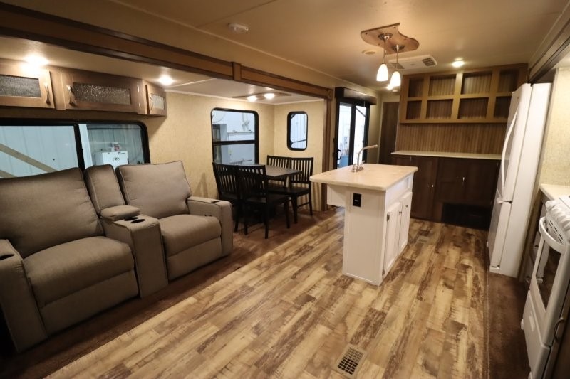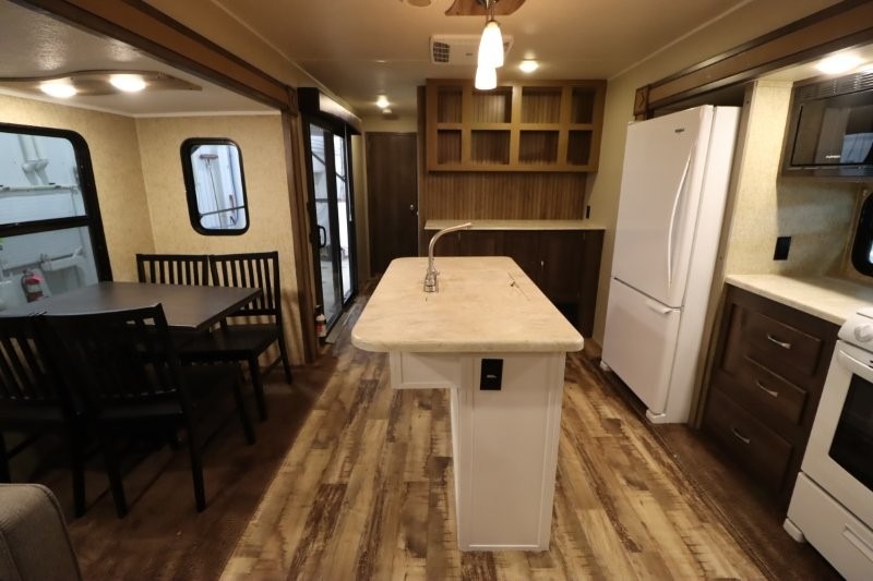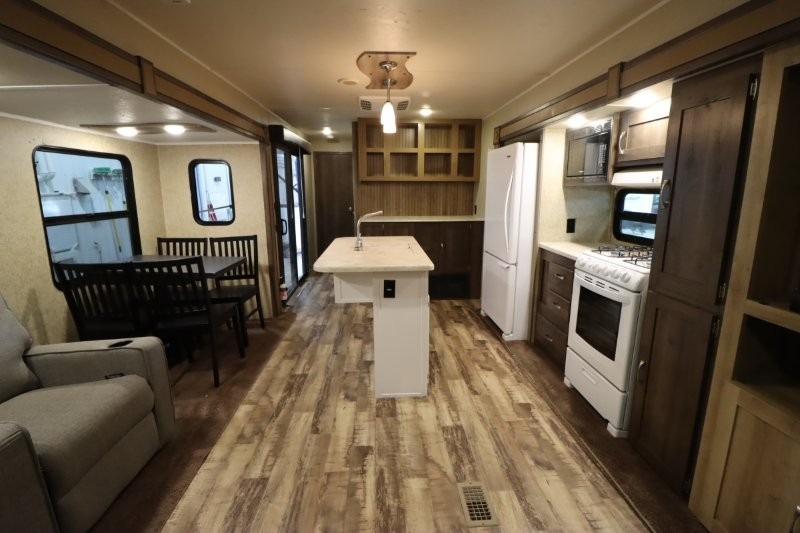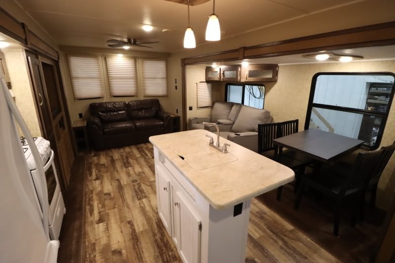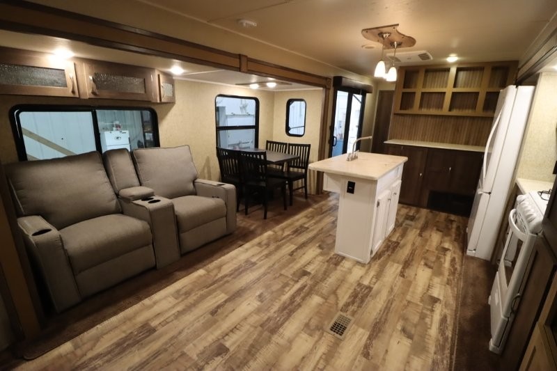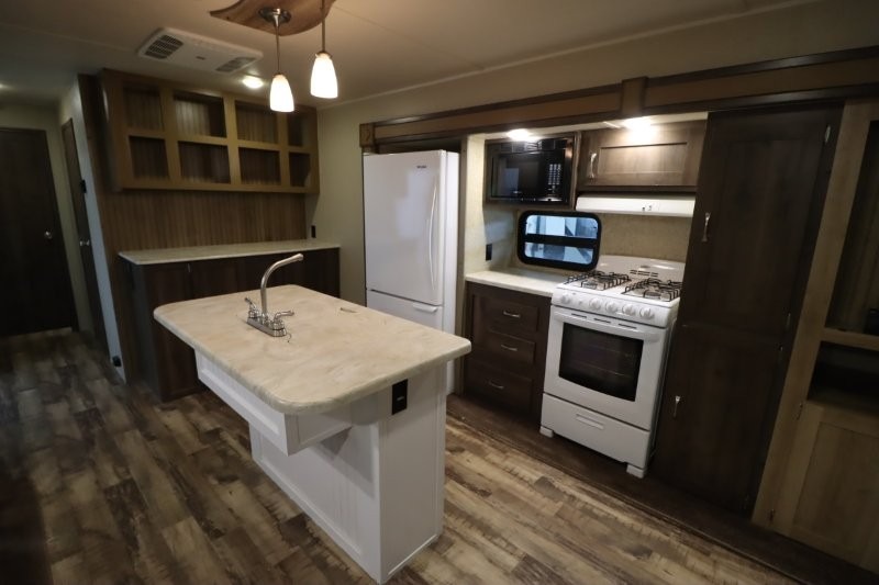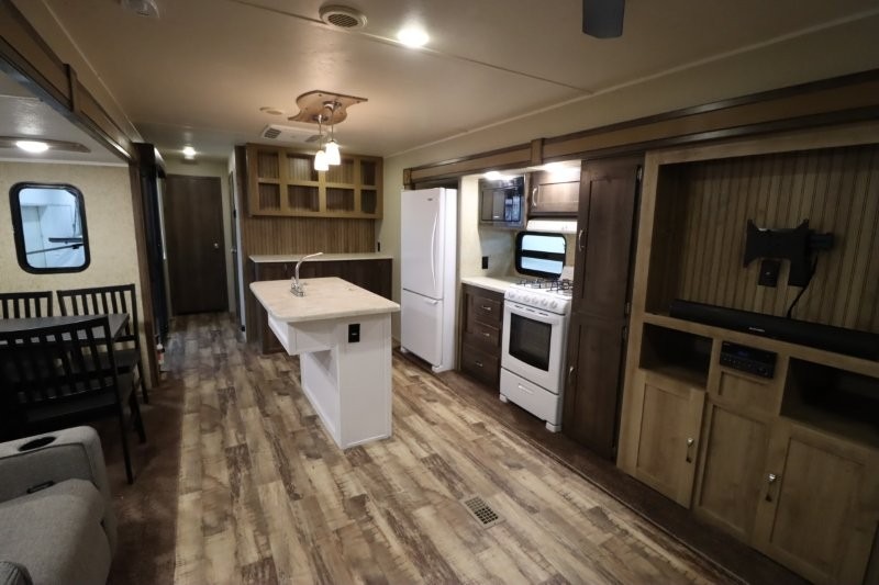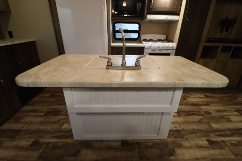 Through the sliding patio doors to your right is a slide out booth dinette and two recliners with overhead storage. A sofa with two end tables and additional overhead cabinets make this a cozy place to visit with family and friends. Along the road side wall is the second slide featuring a TV/entertainment center with optional fireplace below, pantry, three burner range, countertop space, overhead cabinets, and a residential style refrigerator. Additional storage and cabinets are on the interior wall next to the slide. The much desired kitchen island includes a double sink for washing dishes, and counter space for serving or preparing meals.