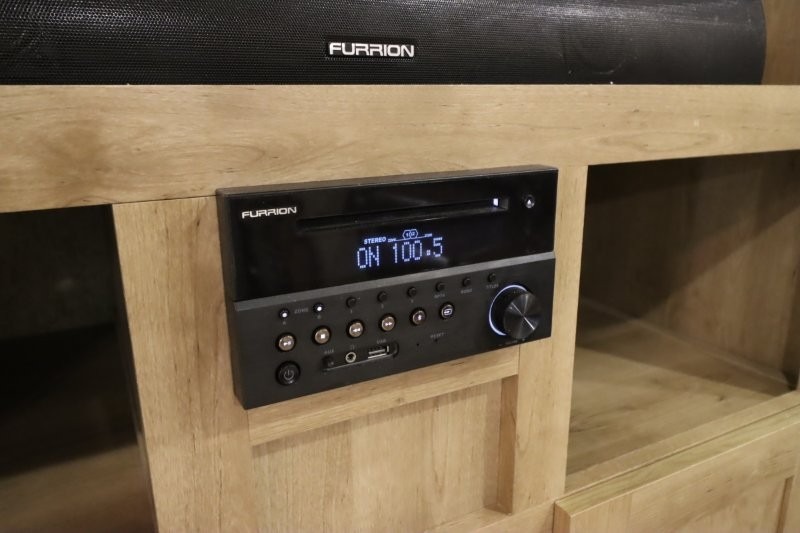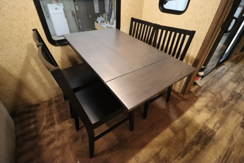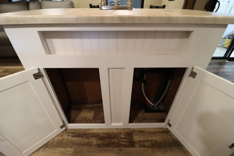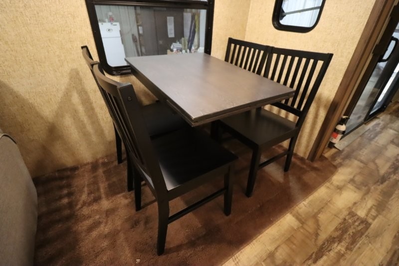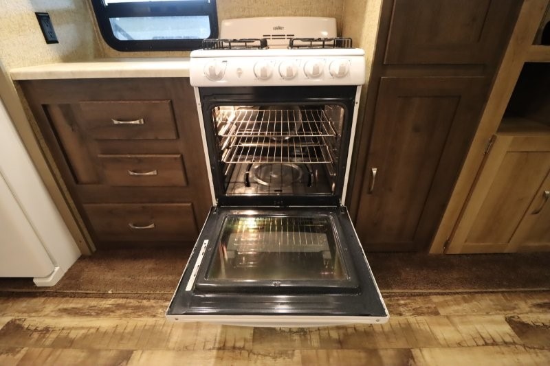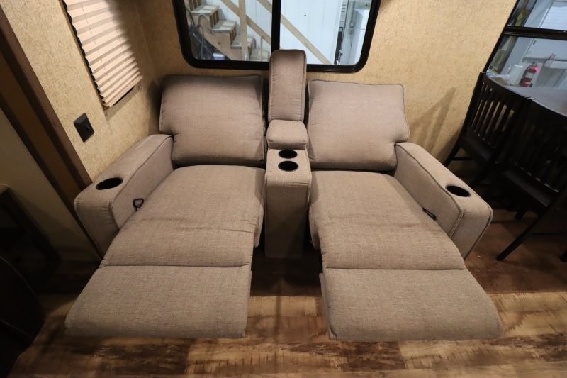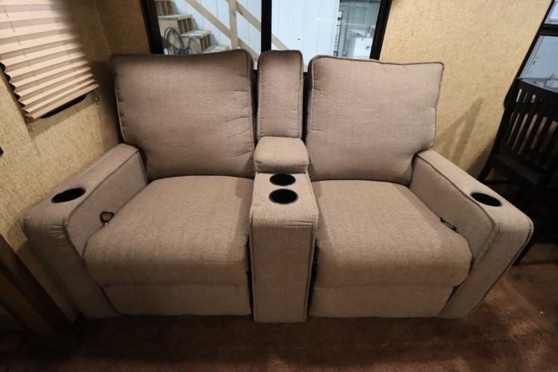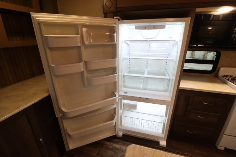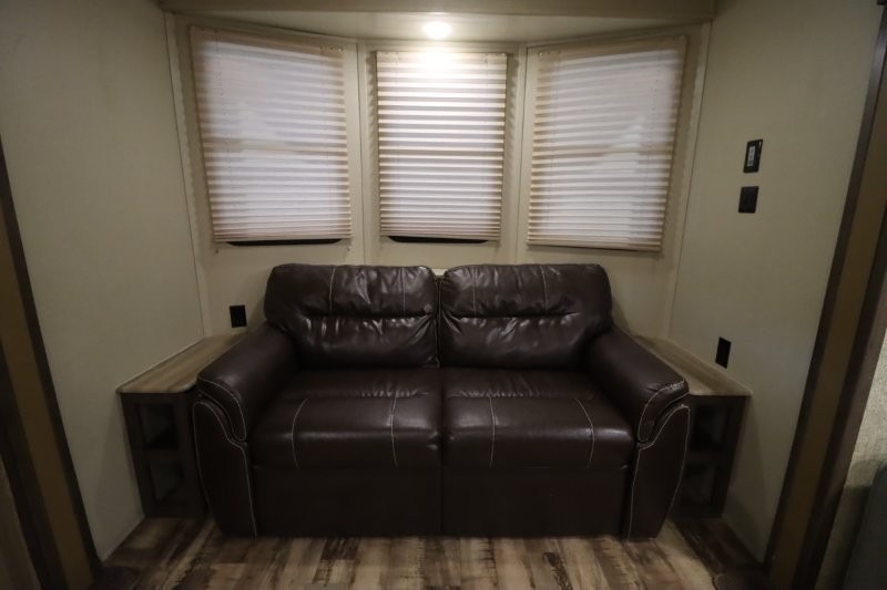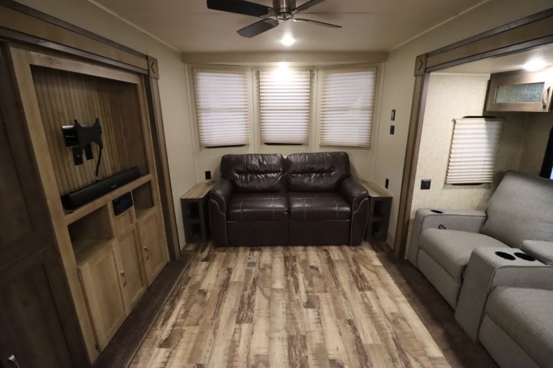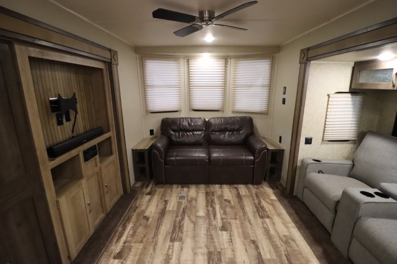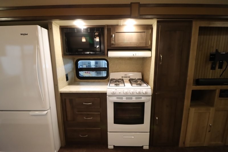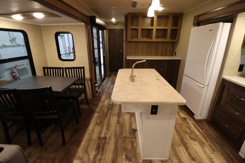 Through the sliding patio doors to your right is a slide out booth dinette and two recliners with overhead storage. A sofa with two end tables and additional overhead cabinets make this a cozy place to visit with family and friends. Along the road side wall is the second slide featuring a TV/entertainment center with optional fireplace below, pantry, three burner range, countertop space, overhead cabinets, and a residential style refrigerator. Additional storage and cabinets are on the interior wall next to the slide. The much desired kitchen island includes a double sink for washing dishes, and counter space for serving or preparing meals.
