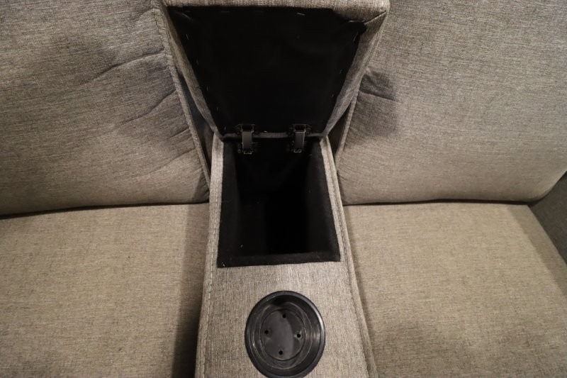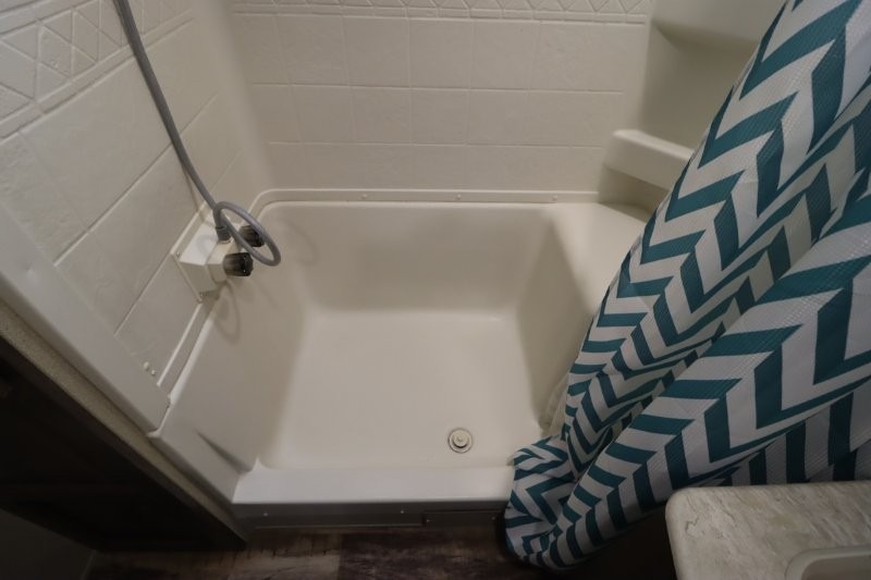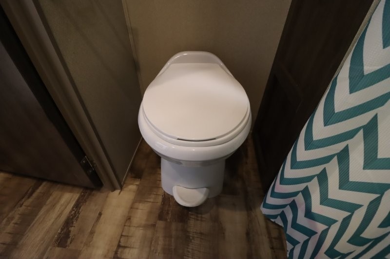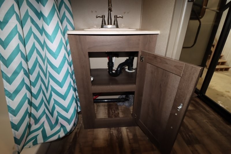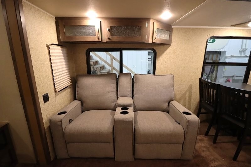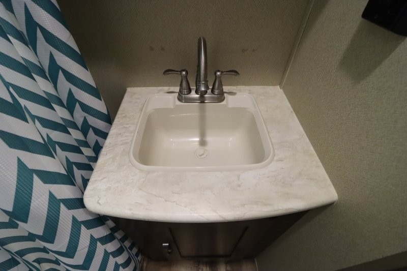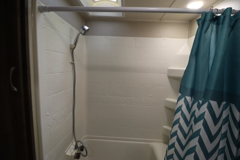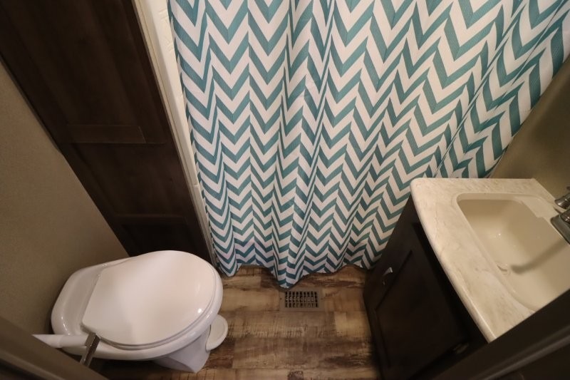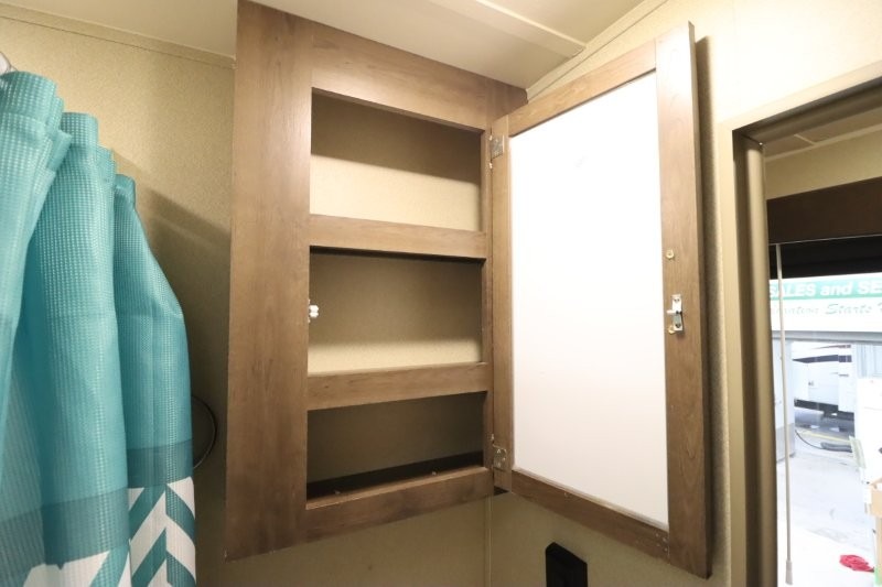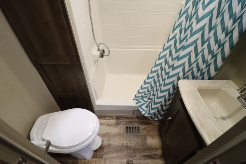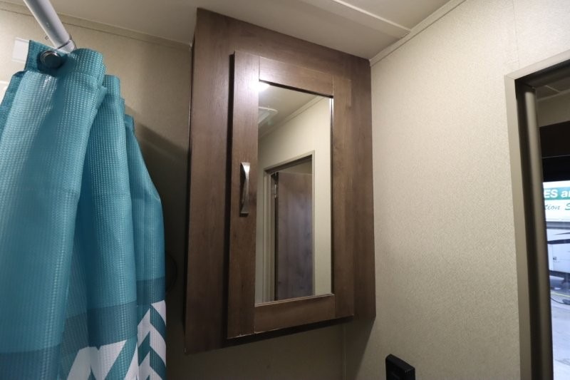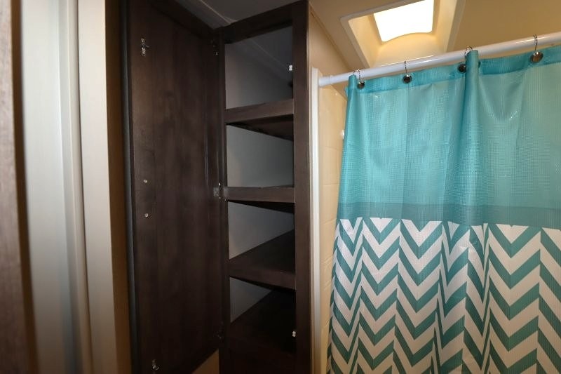 A side aisle bath provides a shower with a seat, linen cabinet, toilet, and sink. The bath door is close to both entrances into the trailer.