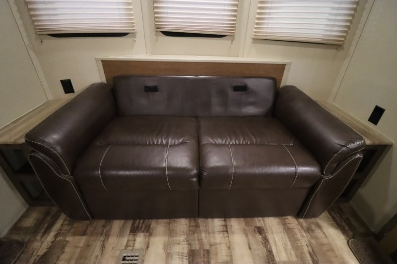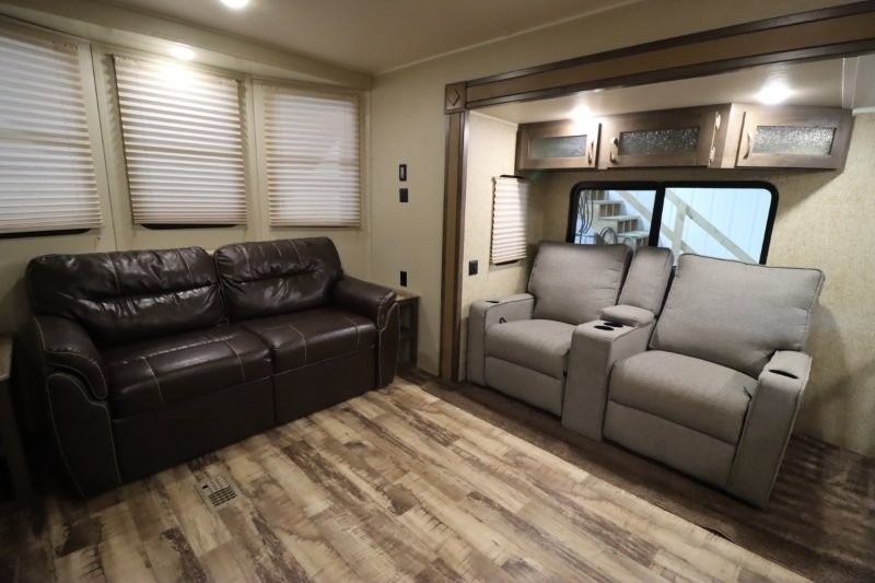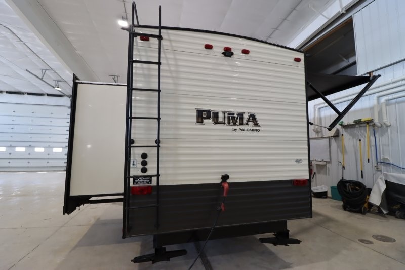 This destination trailer provides all you need to stay in one location for a while. From a front living area, kitchen island, residential style refrigerator to dual recliners, this triple slide Puma 37-PFL by Palomino is sure to impress!
