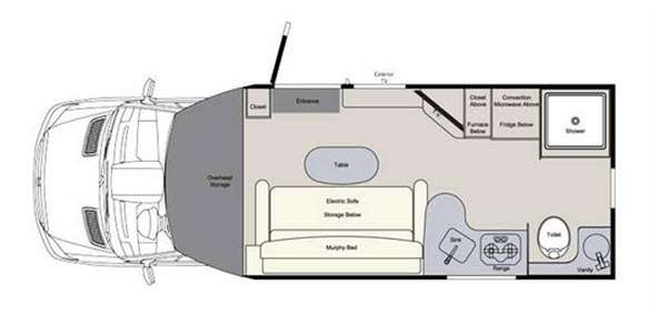 As you enter the motor home your eyes immediately lead you to the electric sofa and table. The sofa folds down and behind the sofa there is a Murphy bed. Plus there is storage below the sofa and a closet by the entry door. Next to the sofa/Murphy bed you will find a sink, and two burner range. Across from the sink you will notice a nice size TV. A second closet provides added storage space for your things. There is also a convention microwave and a refrigerator. You will have no problem making meals on the go!
