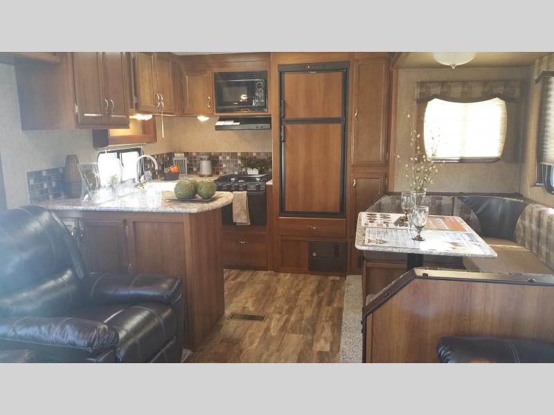 As you enter the 28RKS you will notice two lounge chairs to your left with an overhead cabinet above the chairs. There is a large counter space, double kitchen sink, three burner range, refrigerator, and pantry. The slide has a u-shaped dinette and sofa. Along one wall there is an entertainment center that you are sure to enjoy.
