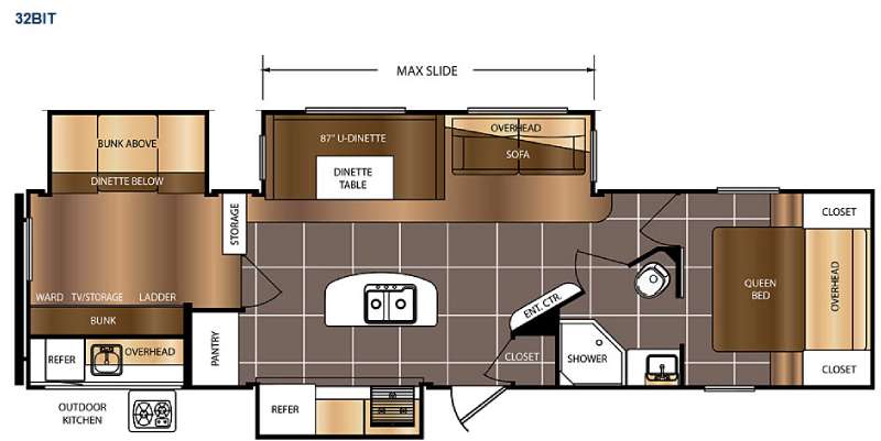 The triple slide 32BIT Avenger travel trailer by Prime Time Manufacturing offers so many great features, such as, a rear bunk house, outside kitchen, and a kitchen island!