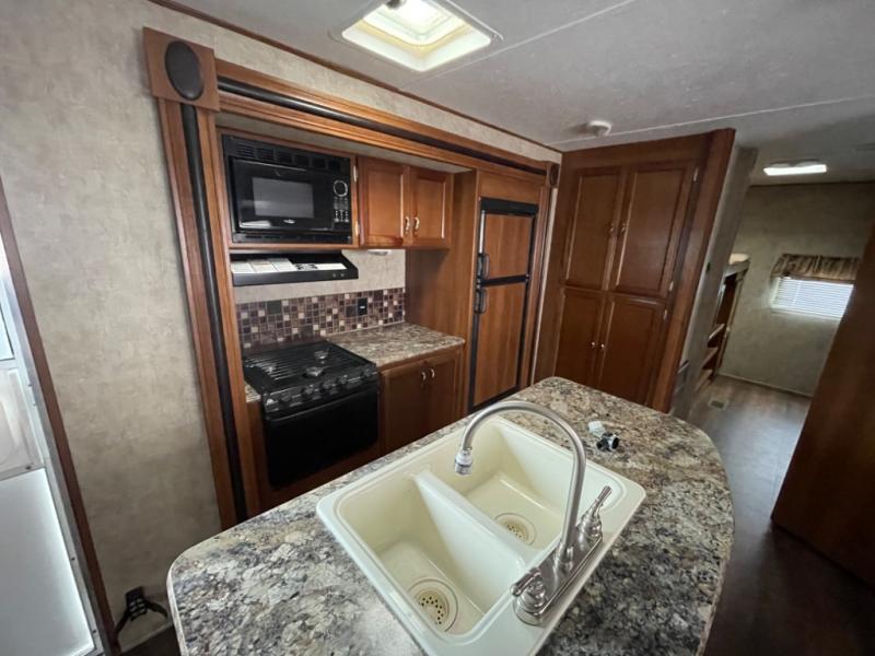 As you enter this travel trailer, you will be in the kitchen and living areas. To the left of the entry door there is a slide with a three burner range, refrigerator, and overhead cabinet. In the middle of the kitchen you will find a kitchen island with a double kitchen sink. The opposite side has a slide with a u-dinette and sofa. In the corner you will enjoy the entertainment center, and closet.