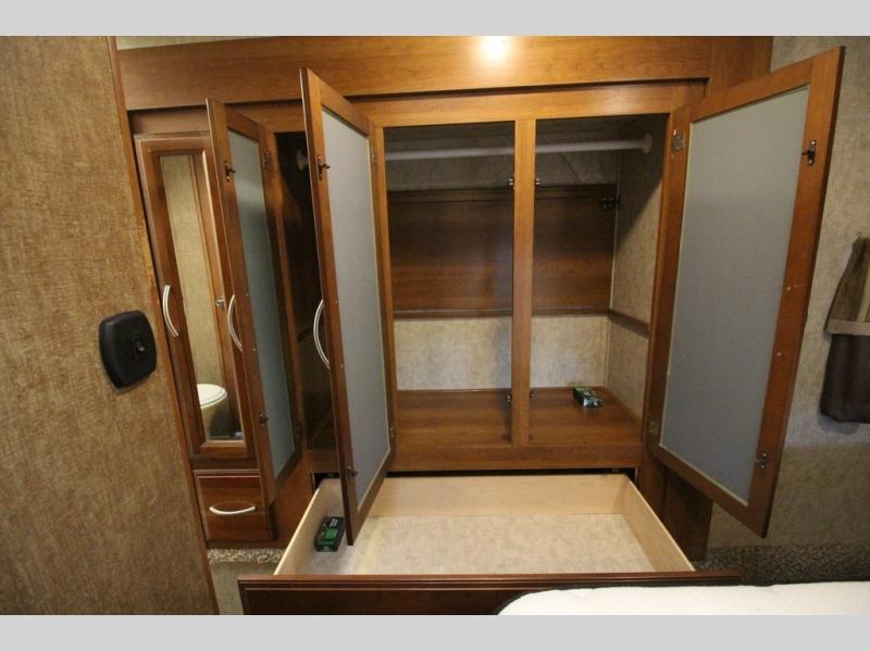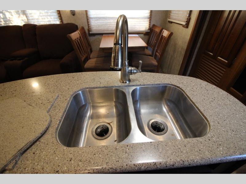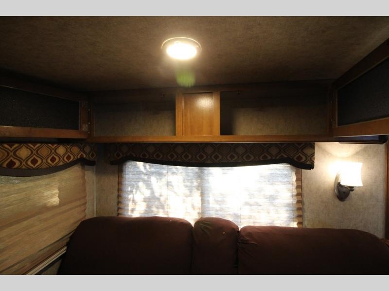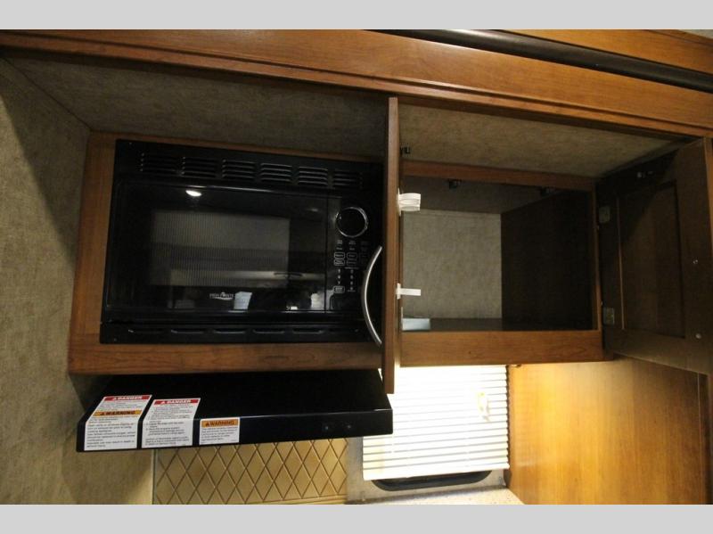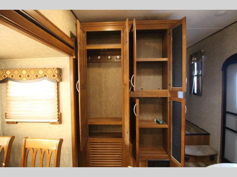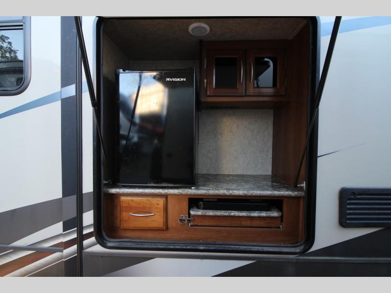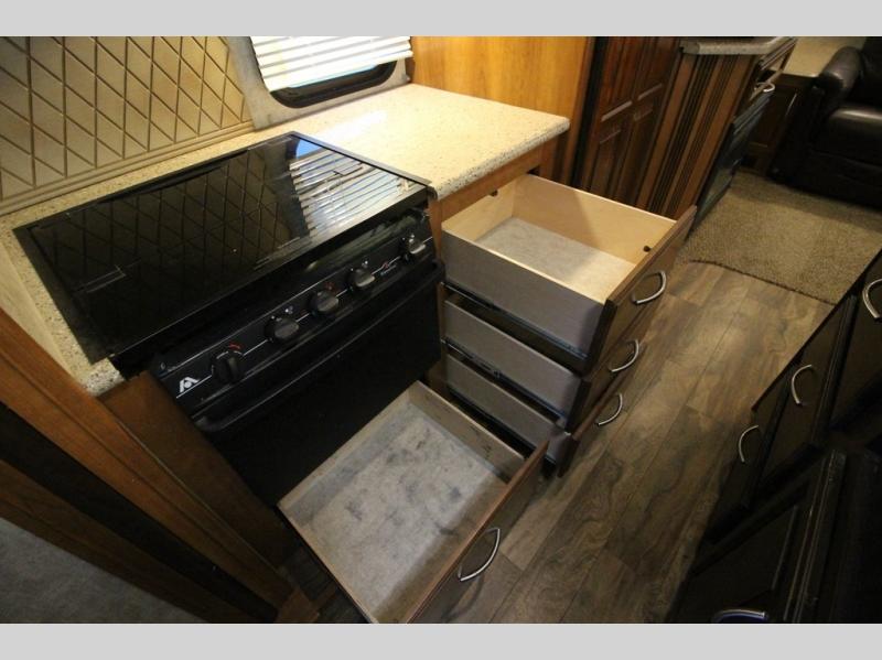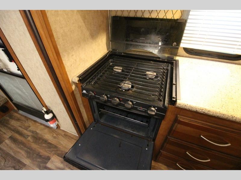Check out the cooking area before heading inside. Along the curb side within the outer slide you will find a refrigerator, overhead storage, and a two burner cook-top. This will make cooking meals easy when you want to enjoy the great outdoors.