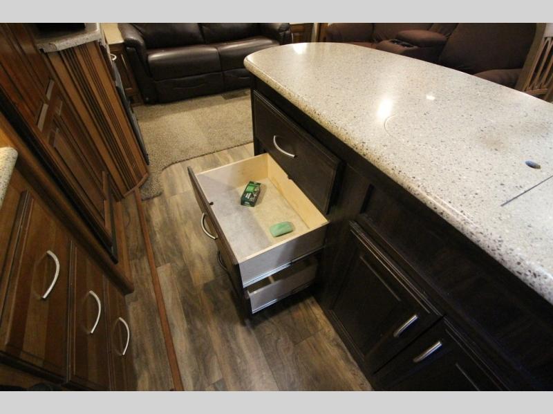 The slide that features the kitchen appliances also features a entertainment center that can easily be viewed by all of the seating in the room. Along the rear wall there is a hide-a-bed sofa with end tables and storage overhead. Opposite the entertainment center find a second slide that features theater seating and a booth dinette. There is storage above the theater seats, and the dinette can easily be turned into sleeping space at night when needed.
