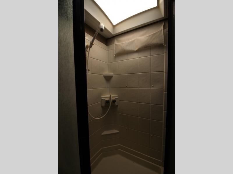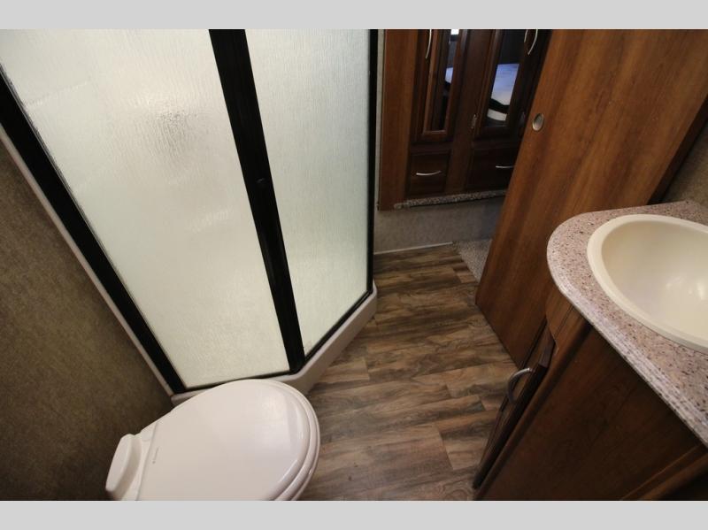 Back at the entry door head to the right up a step to the front master bedroom and complete bath. The bath is on your left at the top and offers a spacious place to freshen up. There is a corner shower, toilet, and vanity with sink. A second entry door in the bath leads into the front master where you have easy access to the linen and wardrobe storage slide out.