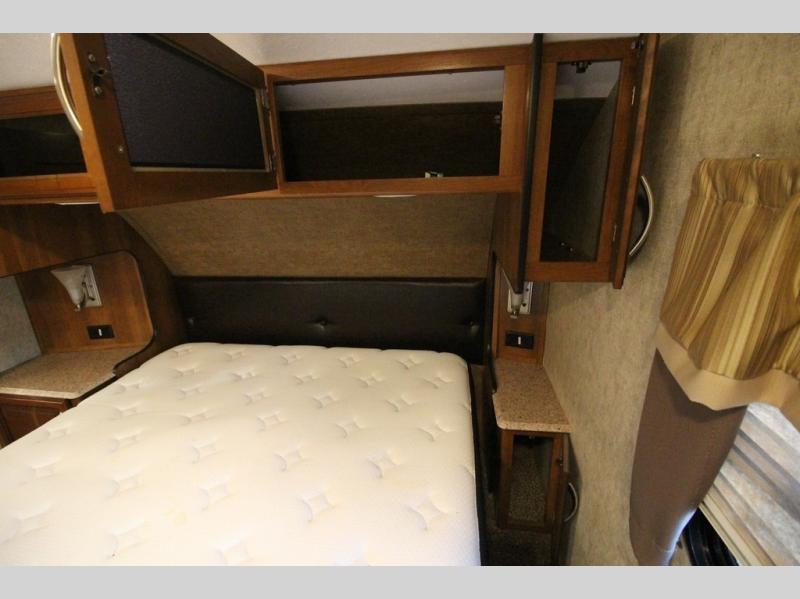 The bedroom can also be accessed from the hallway sliding door. Inside find a queen size bed with dual bedside wardrobes and overhead cabinets. There is additional storage in the wardrobe as well.