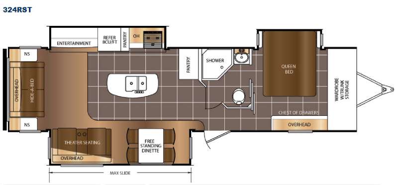 As you enter the travel trailer, you have a slide with a free-standing table, and theater seating to your left. The rear wall has a hide-a-bed sofa with nightstands on either side of the sofa. There is one more slide in the rear of the travel trailer with an entertainment center, refrigerator, and three burner range. In the corner of the kitchen you will find a nice size pantry for food storage. The kitchen also offers an island with a kitchen sink.