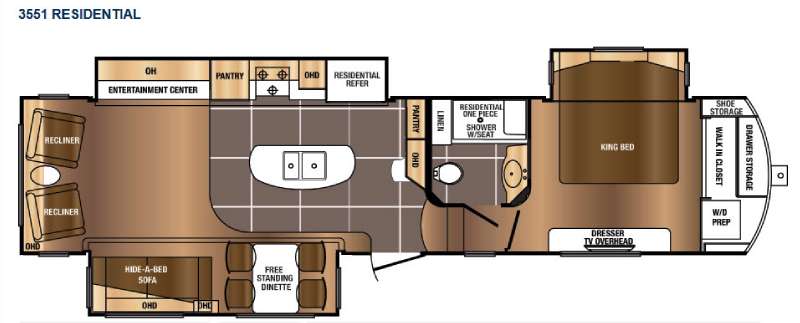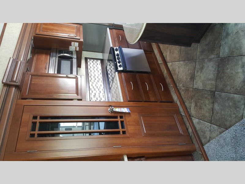 As you enter the fifth wheel, to the left there is a slide with a free-standing table and chairs and hide-a-bed sofa. Along the rear wall you will find two recliners. There is another slide in the main living area with an entertainment center, pantry, three burner range, and refrigerator. You will find an additional pantry, and a kitchen island with a double kitchen sink and lots of counter space.