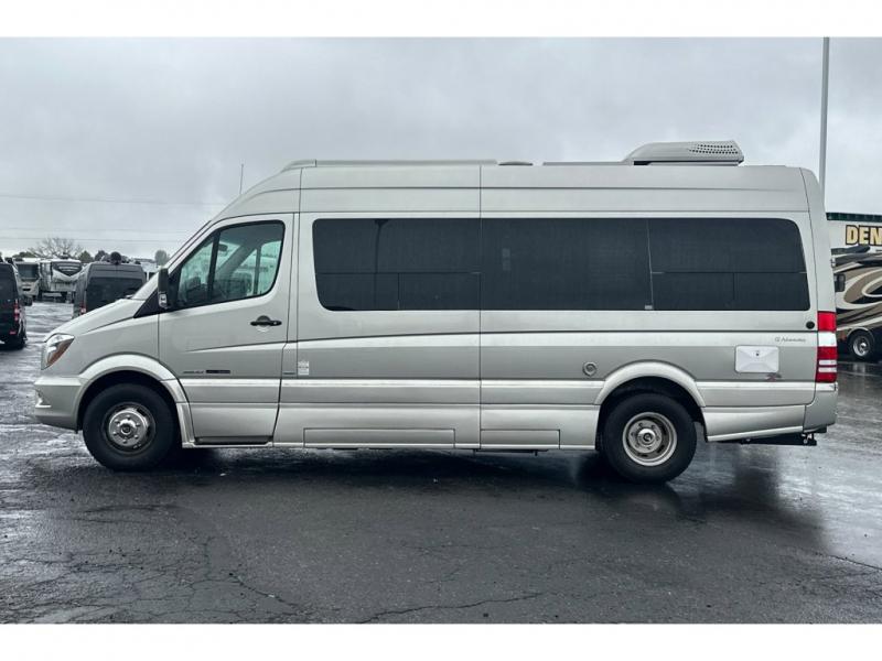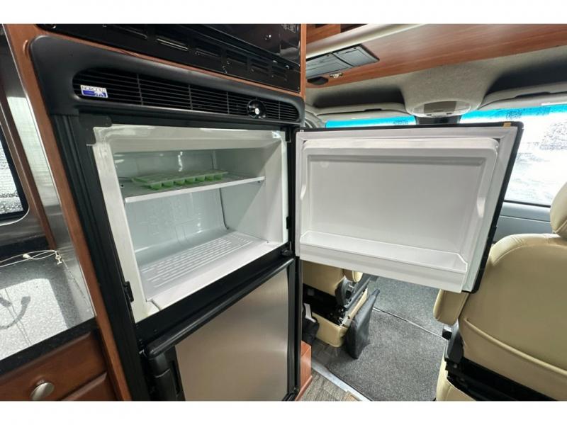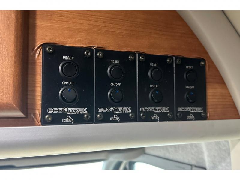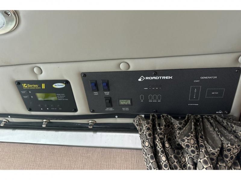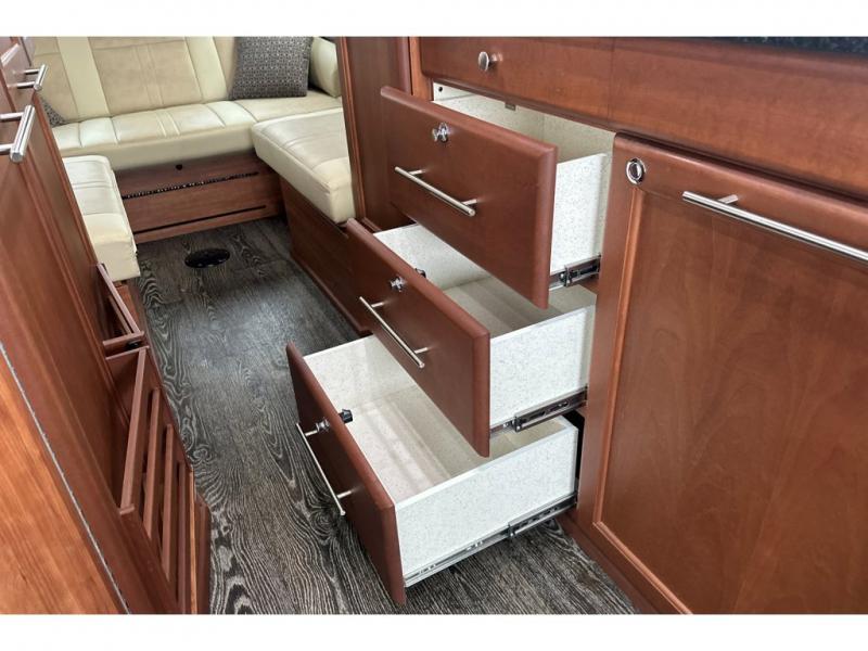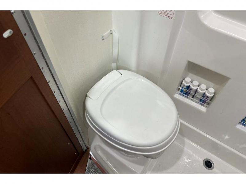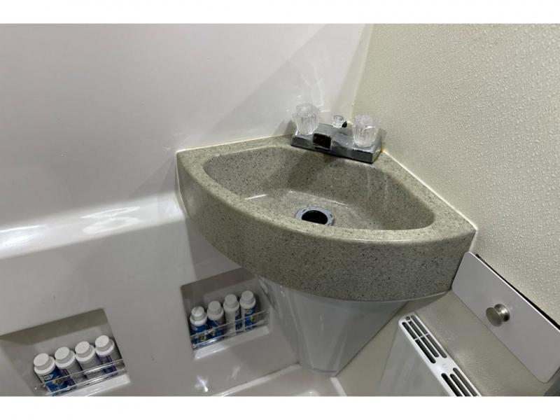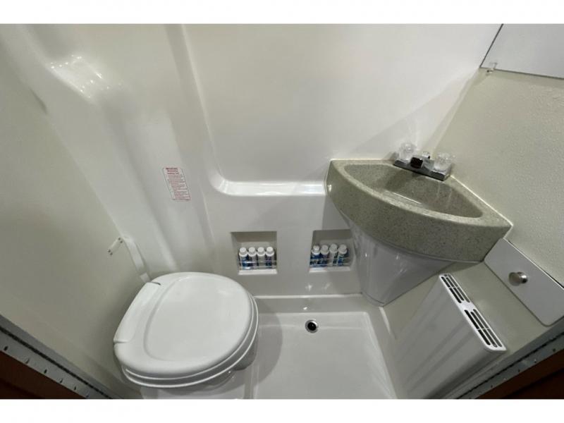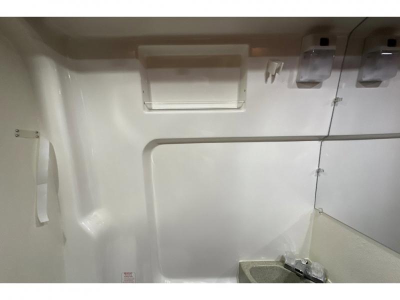 The front offers three comfortable swivel captain's chairs with a table. The passenger side chairs can be converted to additional sleeping. A toilet, sink and shower are enclosed along the passenger side. Continuing to the back there is a wardrobe.