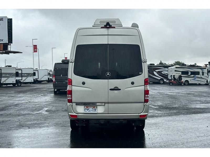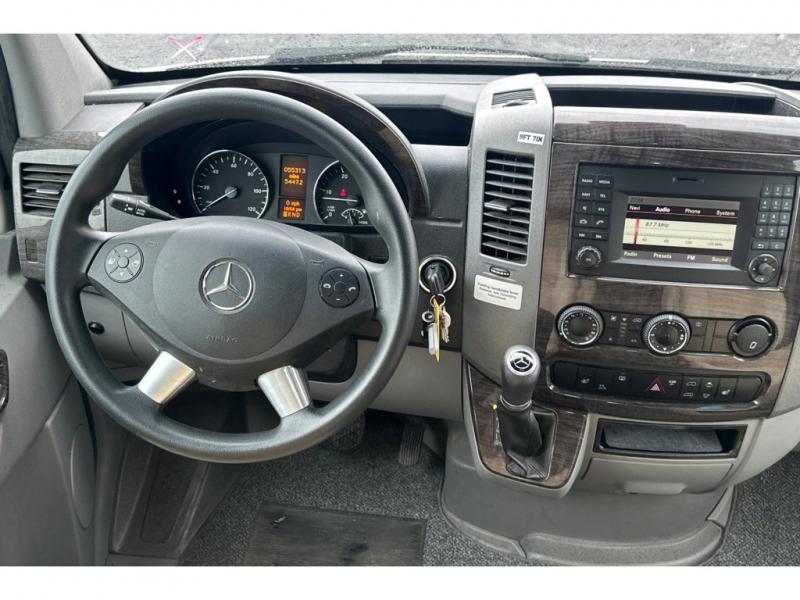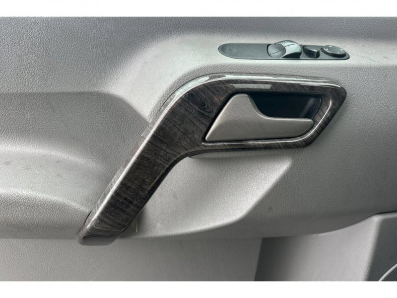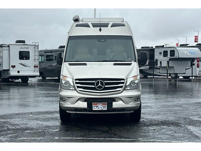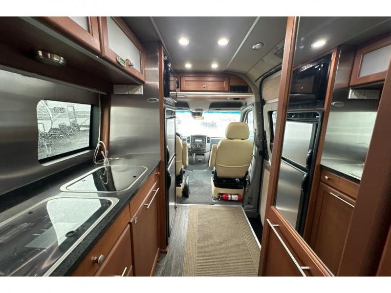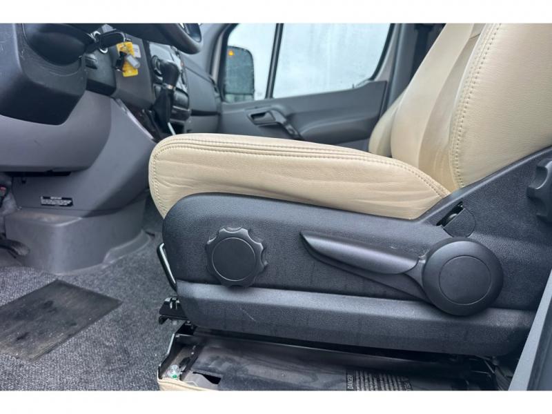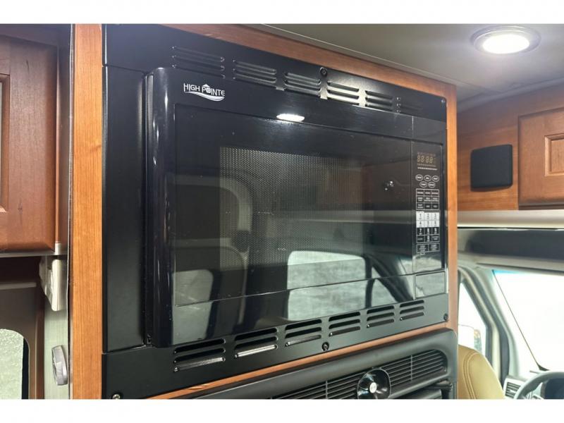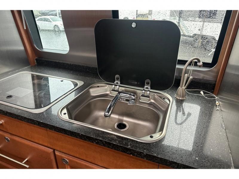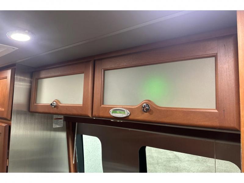 The front offers three comfortable swivel captain's chairs with a table. The passenger side chairs can be converted to additional sleeping. A toilet, sink and shower are enclosed along the passenger side. Continuing to the back there is a wardrobe.