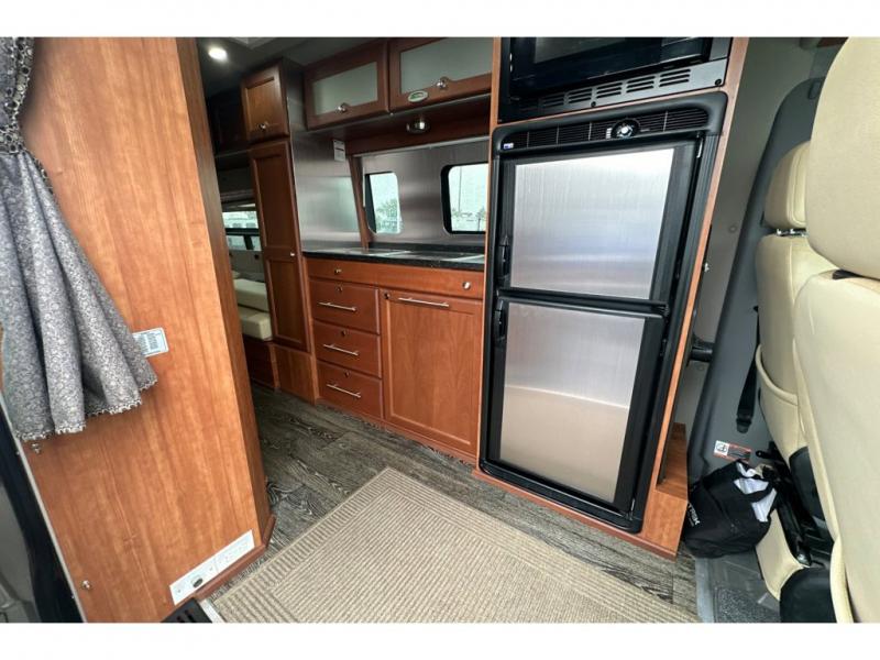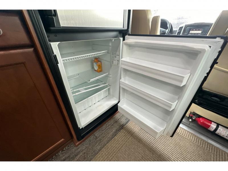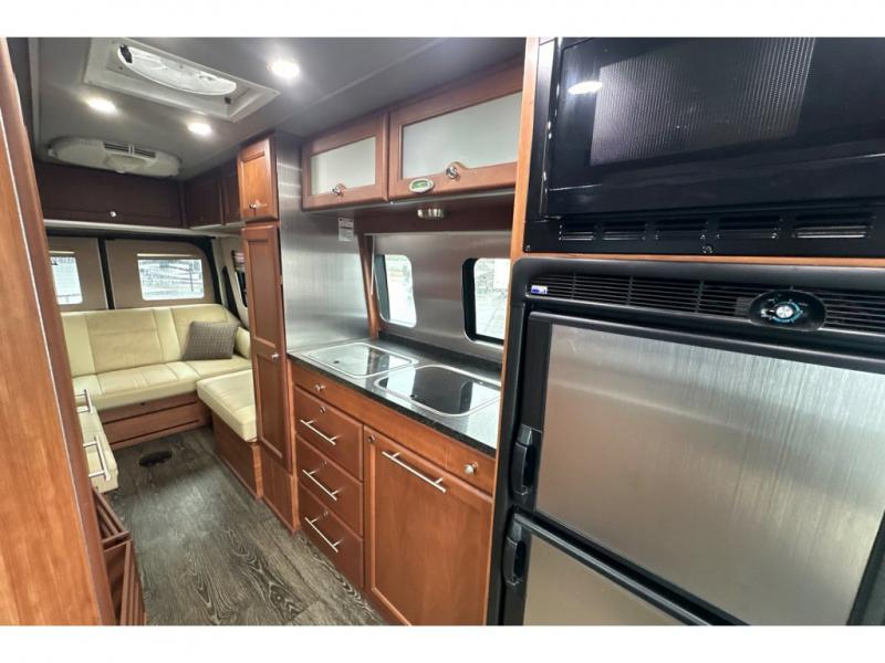 On the opposite side, you will find a two burner stove top as well as a sink, refrigerator and microwave with plenty of storage and more!