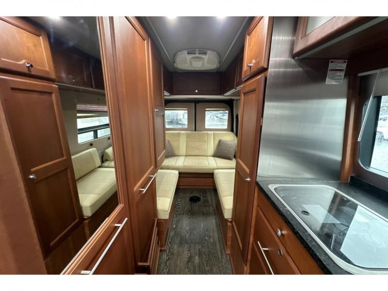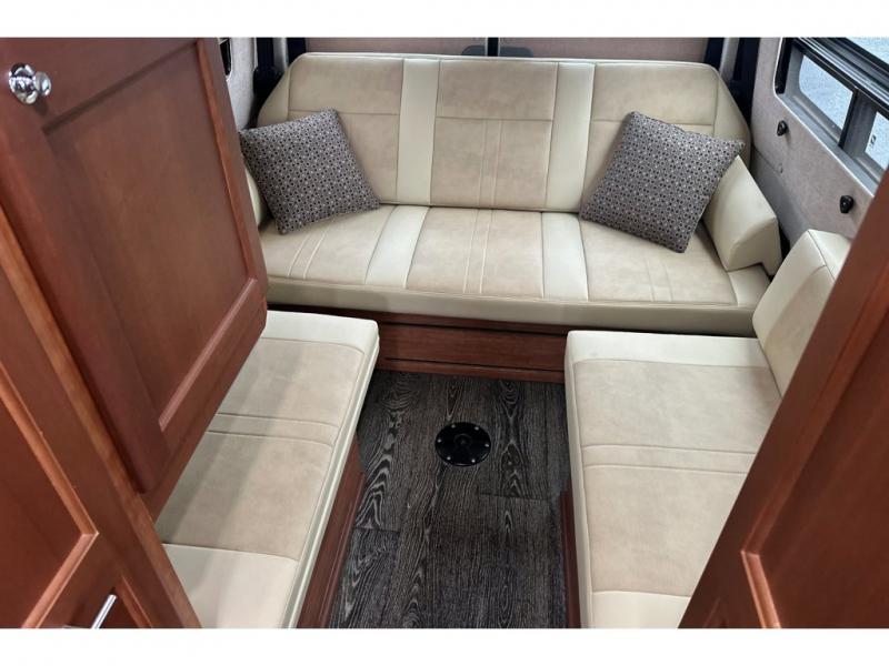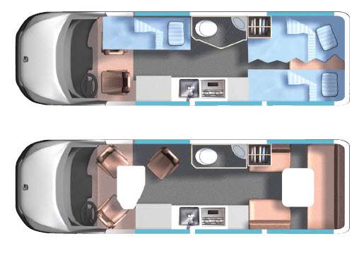 The CS Adventurous Class B diesel coach offers a standard electric power sofa that reclines to provide a king size bed or two twin beds. There is an additional bench seat on both sides for plenty of seating around the back table.
