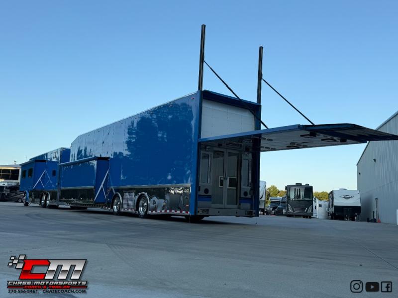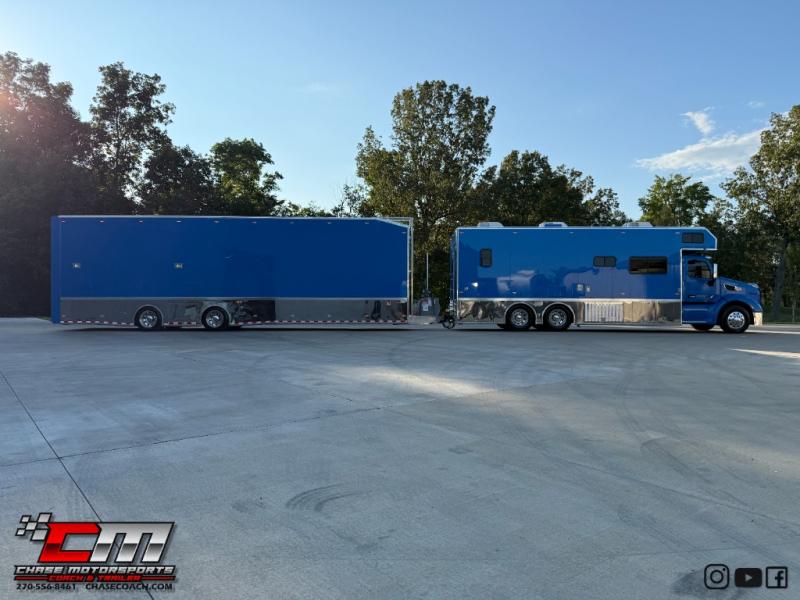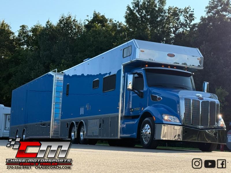 2016 S&S For Sale! Bunkhouse Motorhome & 40’ Liftgate Trailer, Slideout on Motorhome & Trailer, Tall Upper Deck in Trailer, Peterbilt 579 Chassis, Cummins ISX 550HP Engine, 18SPD UltraShift Auto Trans, 185K Miles, Sleeps up to 8 (Has 5 Beds Total), Full Bath w/Toilet, Vanity, & Shower, Upgraded Cherry Cabinets & Hardwood Flooring!, Granite Countertops, Two Jack-Knife Sofa’s, Dinette that Seats Four, Samsung TV’s, In-Motion Satelitte, Surround Sound, Four Door Fridge/Freezer, (3) 15K BTU Roof Airs, 20KW PowerTech Diesel Generator, 40’ Liftgate Trailer, 56” Upper Deck Height, LOADED with Cabinets!, Spring Smasher & Shock Dyno Cabinet, Rubber Coin Floor, In-Floor Storage, Big A/C System w/Heat, Aluminum Tire Racks, Fridge, Air Compressor, Plumbed for Air & Nitrogen, Nitrogen Tank Storage Cabinet, Winch In Upper Deck, Walk-On Roof w/Ladder Access, Blue Exterior w/Polished Stainless Lower Metal & Rear Door, Needs NOTHING! Both the Coach Trailer are LOADED with OPTIONS!! Too many to list them all!