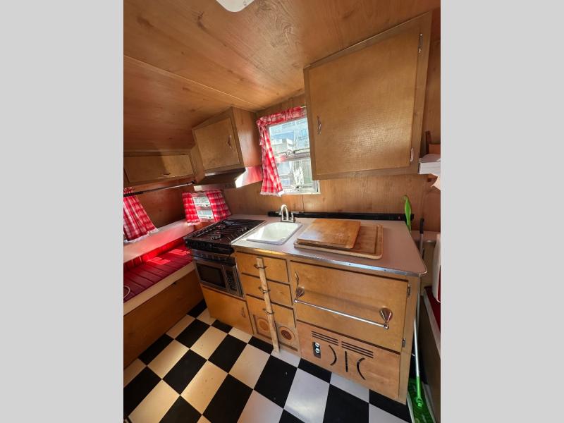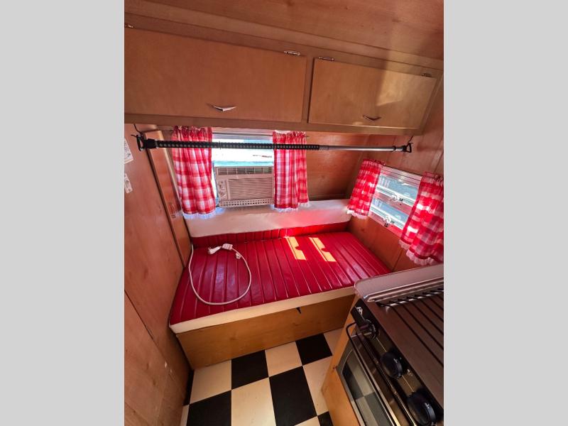 Inside find a 54" dinette in front with overhead cabinets that sport the same detailing. The 32" table folds down at night to easily make into a sleeping space for two.