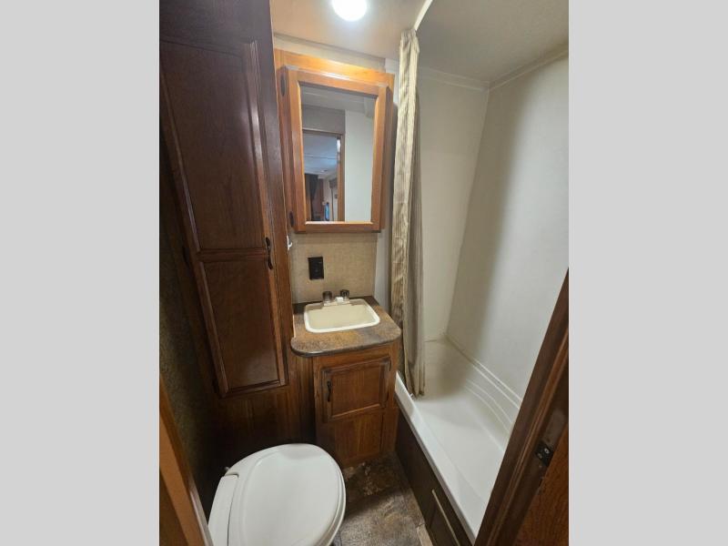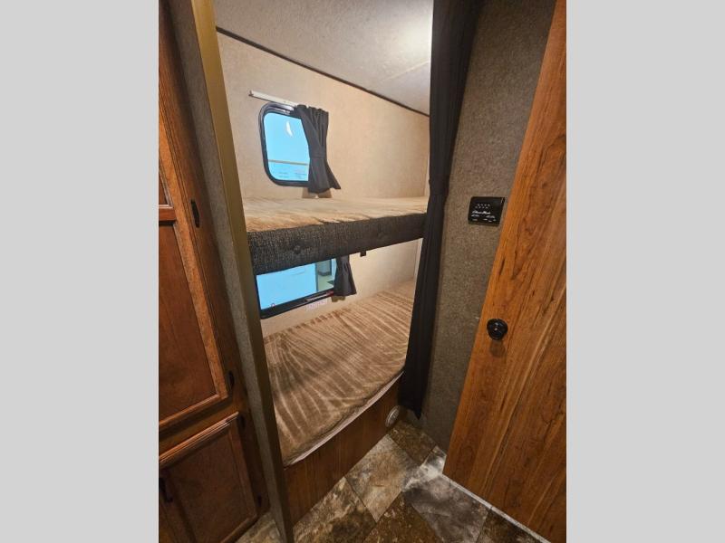 The rear corner bath features a tub/shower, toilet and sink, plus linen cabinet. There is also a set of bunks beds in the opposite rear corner in back.