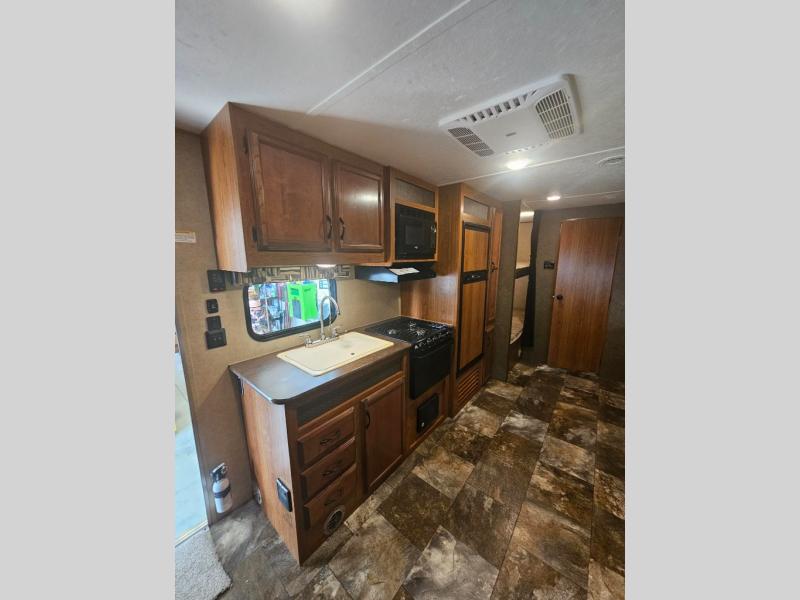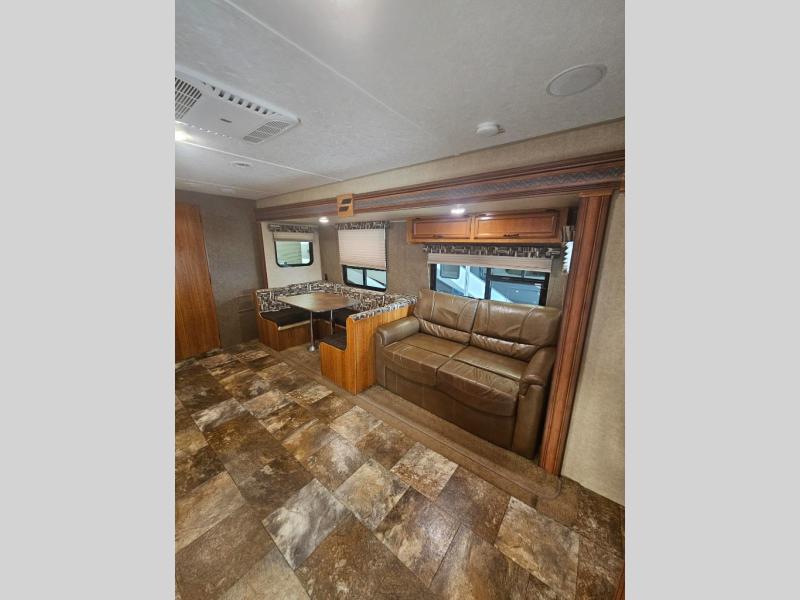 In the living area enjoy added space with the large slide out fully extended. There is a u-shaped dinette and sofa with overhead cabinet. You will enjoy plenty of seating for everyone at mealtime, and even for watching TV or just hanging out.