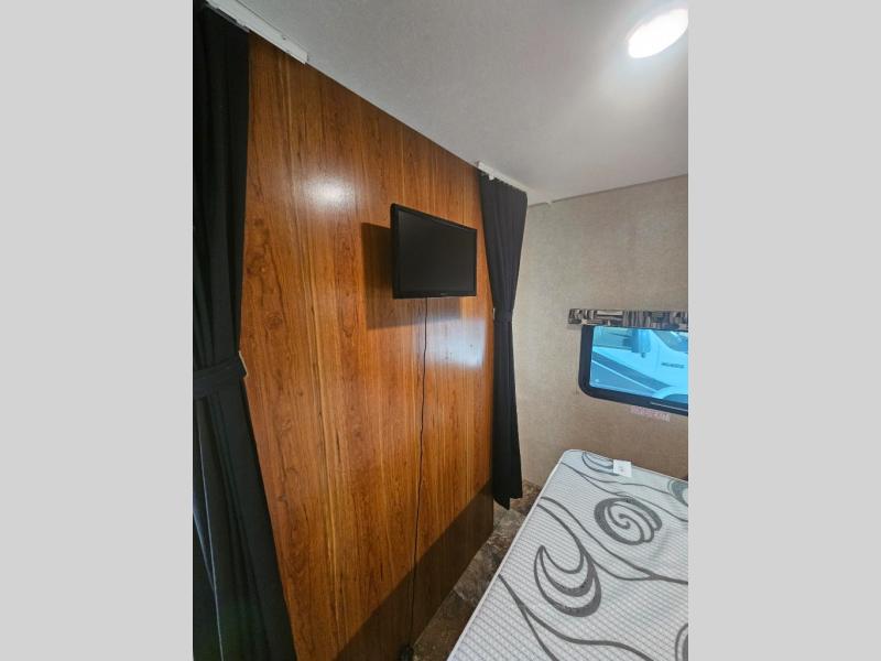 As you step inside you will notice the front bedroom with queen size bed to your right. There are nightstands and wardrobes on each side of the bed along with an overhead shelf for convenience. Enjoy a bit of privacy at night by pulling the curtain closed on either side of the entertainment center that sits just a bit off the foot of the bed.
