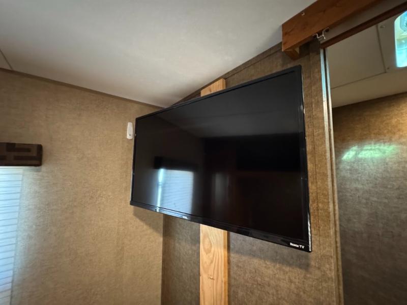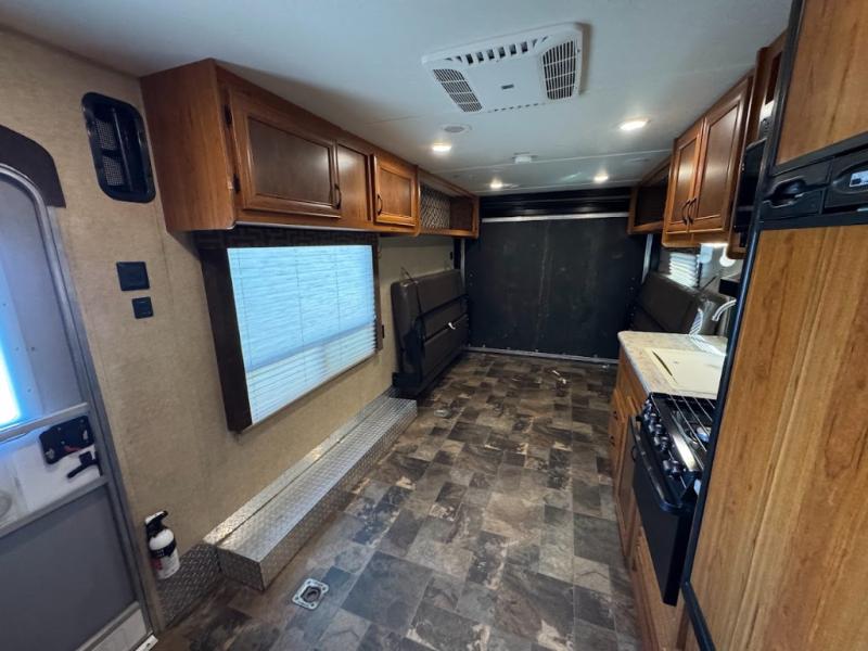 The rear 7'x 6' ramp door will make loading and unloading a breeze. Inside you will find up to 14' 6" of cargo toy parking space. Once you reach your destination and the toys are removed you can create a bit more living space. There are two fold-up sofas with a removable table between. You can also add a couple of lounge chairs opposite the kitchen which includes a double sink, a three burner range with overhead microwave oven, and refrigerator. There is also an entertainment center to the right through the side entry door for easily viewing throughout the unit.