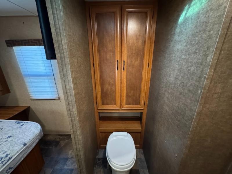 Next to the entertainment center find a walk through bath featuring a toilet on your right, and angled shower plus vanity sink on your left. A pocket door leads into the rear master bedroom from inside the bathroom.