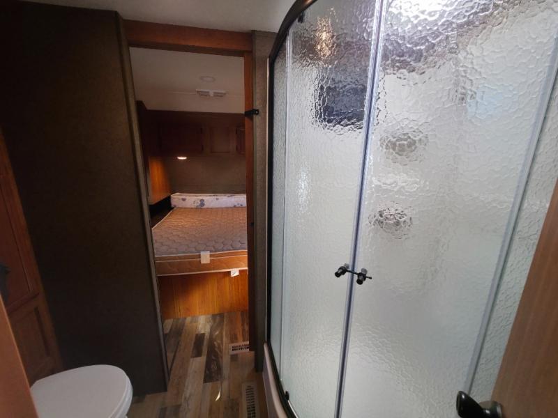 When you head toward the front you will pass through the bath with shower and sink on your right, and toilet with linen cabinet on the left.