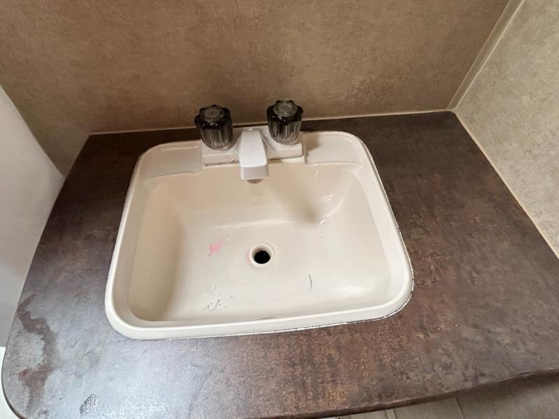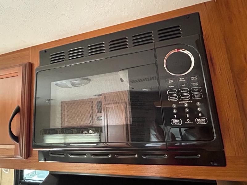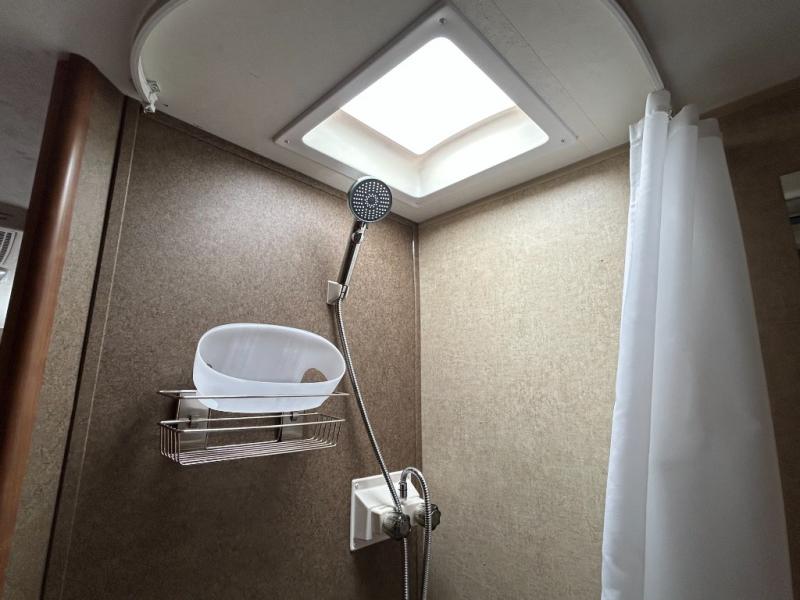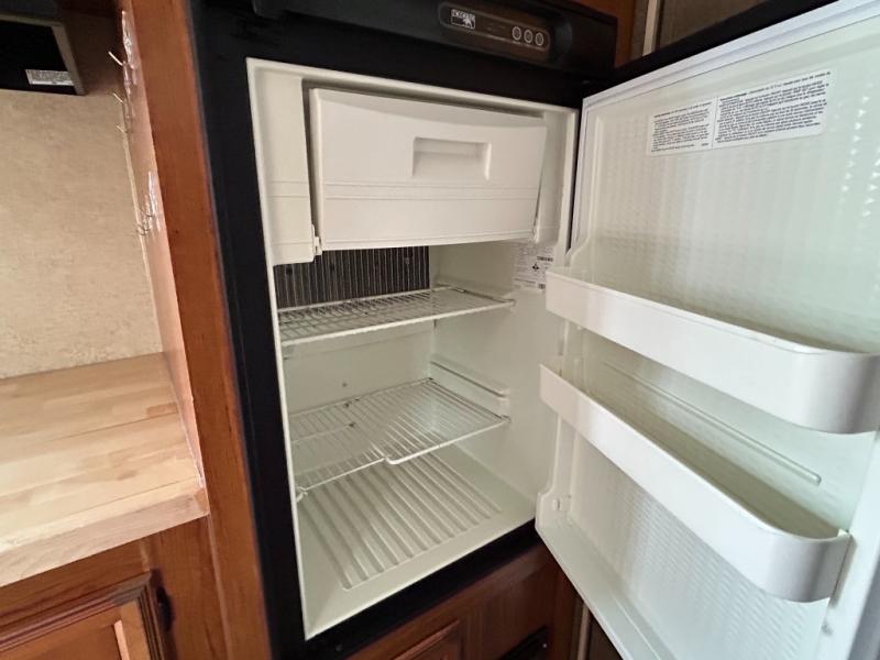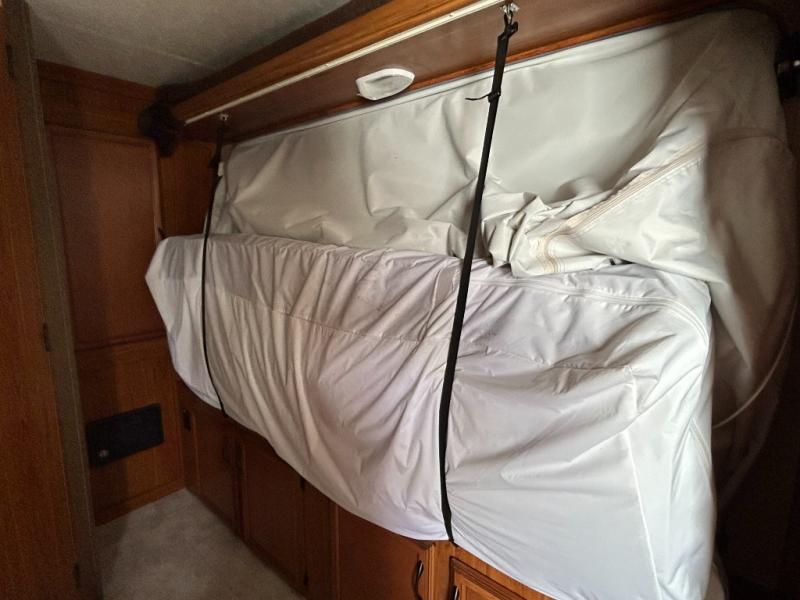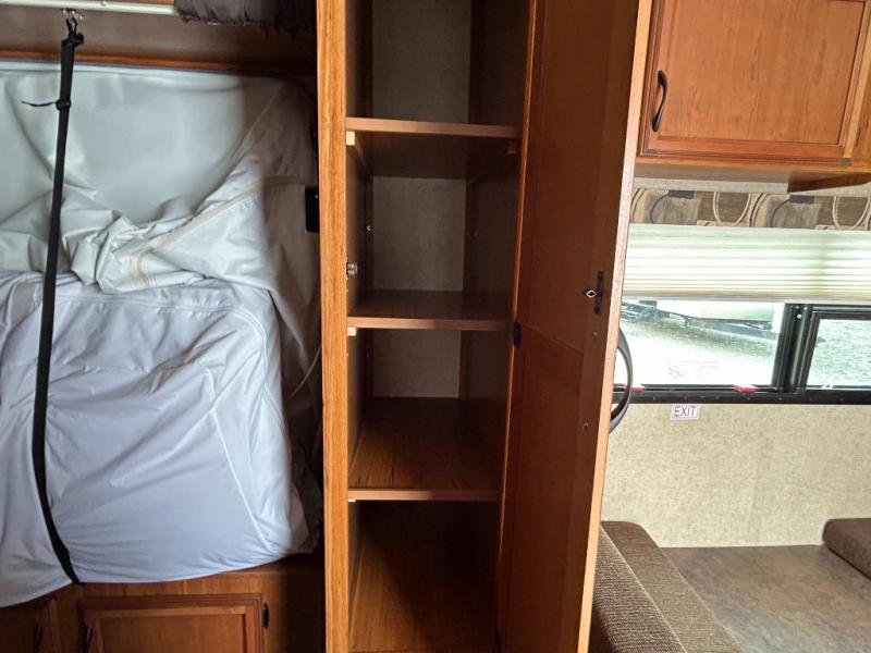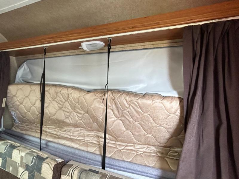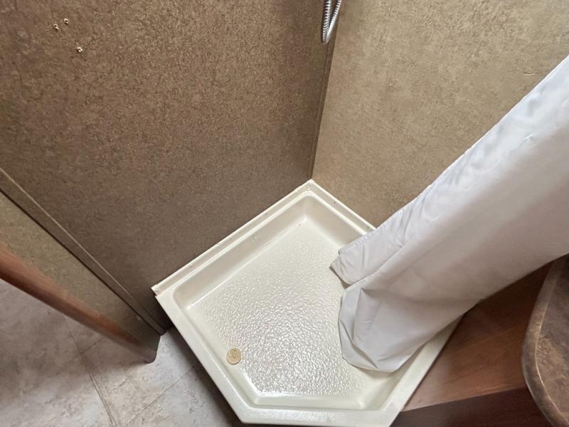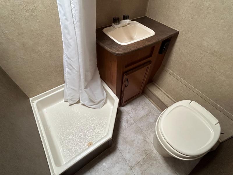 As you step inside you will see a full bed up front with overhead cabinet for storage. Next to the bed is a convenient bath featuring a tub/shower, toilet, and linen cabinet.