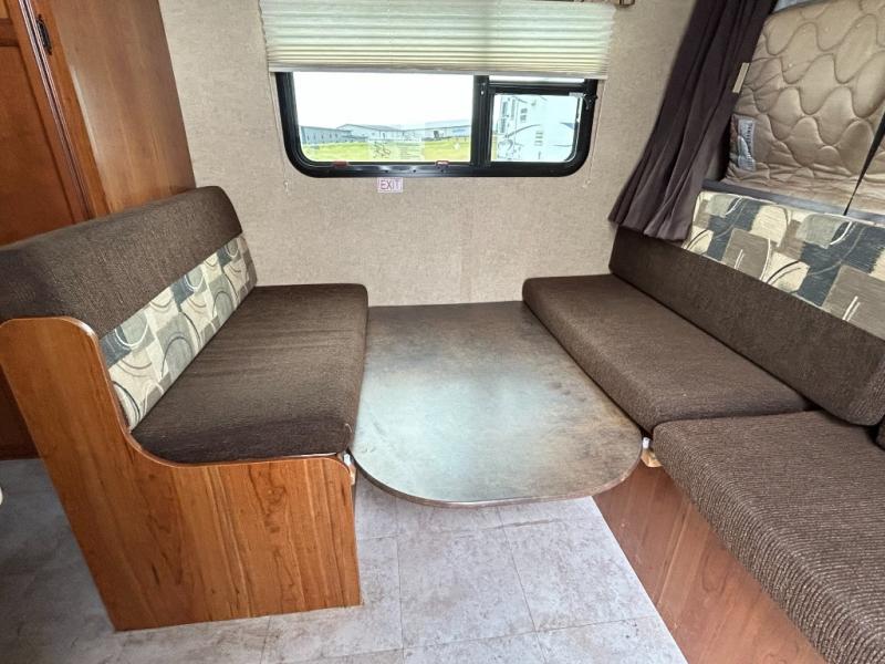 The rear of this unit features a booth dinette including an overhead cabinet for storage. This can also be made into more sleeping space if needed.