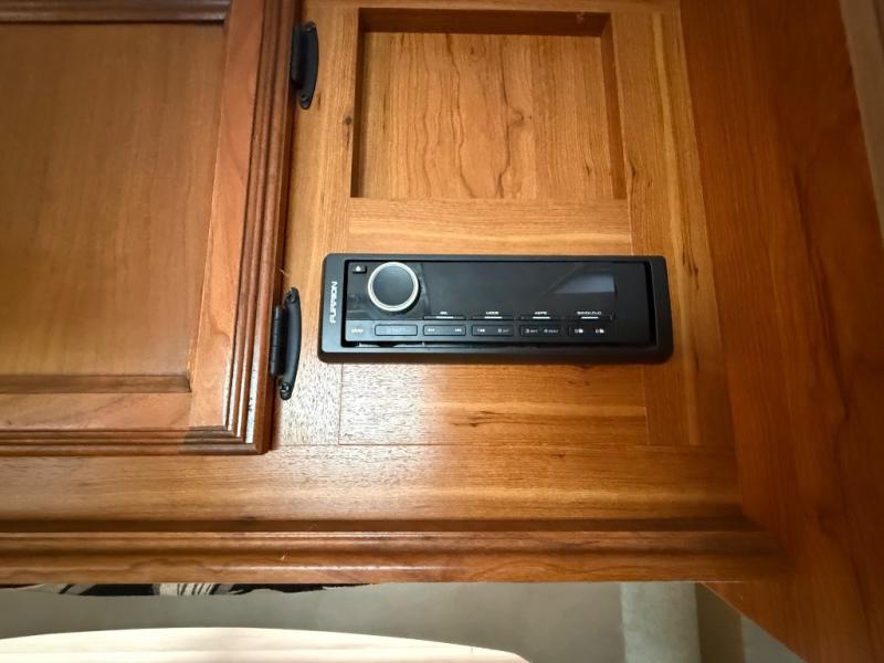 There is a large u-shaped dinette for meal time, playing games, or just relaxing. There is also a sofa opposite with overhead cabinets above. Here you could choose a jack knife sofa option instead. Both can be used for additional sleeping space if needed at night. A wardrobe with TV prep above it sits next to the dinette.