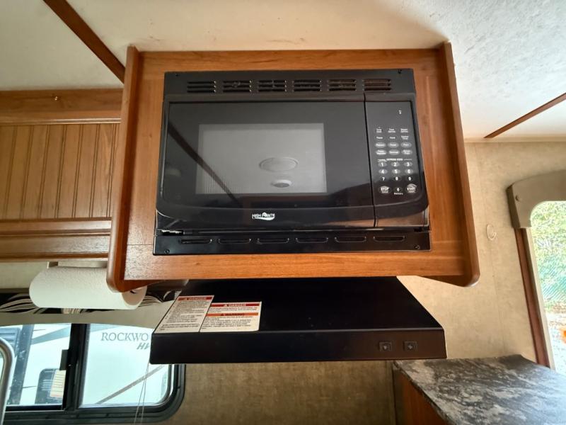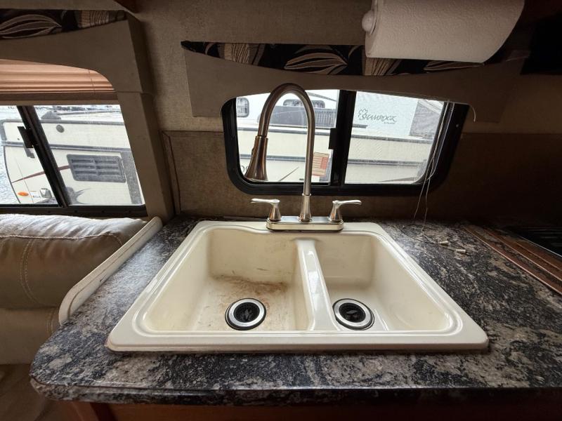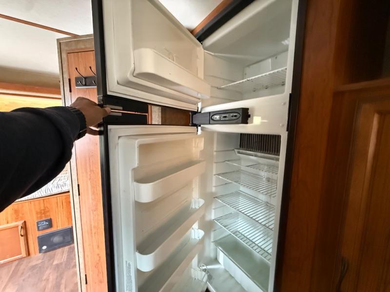 Enjoy cooking light meals and snacks in this Travel Star kitchen which features a pantry for storage, a three burner range with microwave above, and a large sink with overhead cabinet on the door side. Across the unit you will find a refrigerator to keep your perishables cold and fresh.
