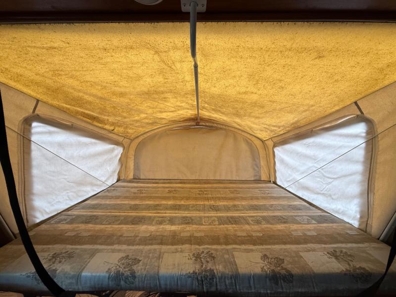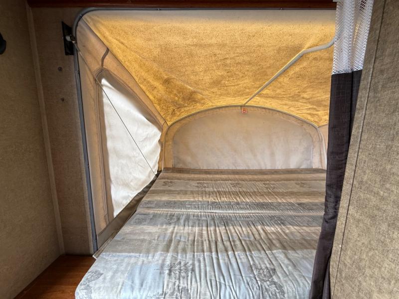 Step inside and notice the queen size tent end expandable bed to your immediate left. There is an overhead shelf above the opening for convenience.