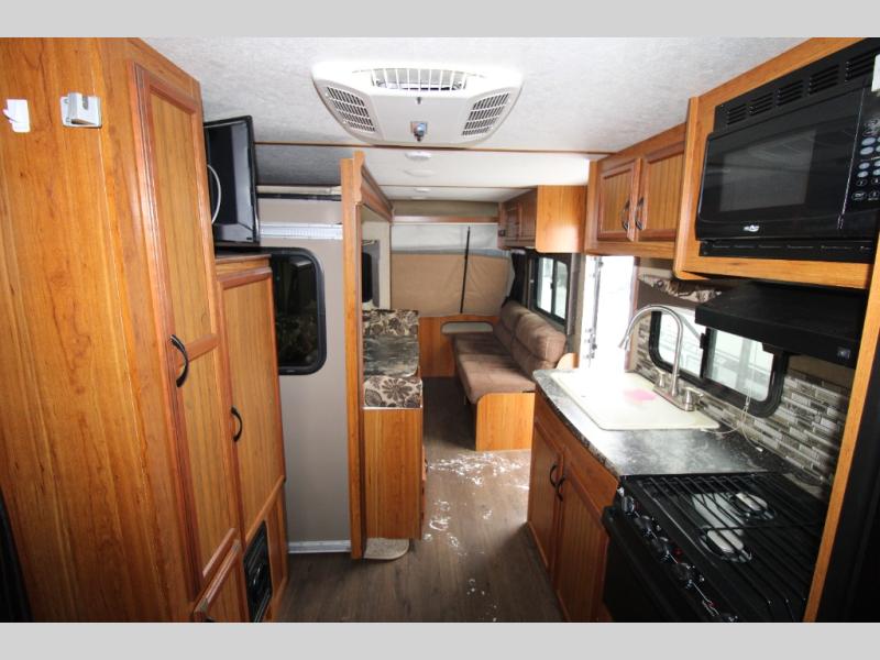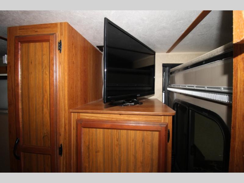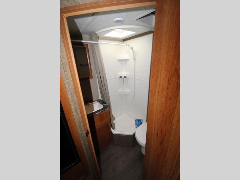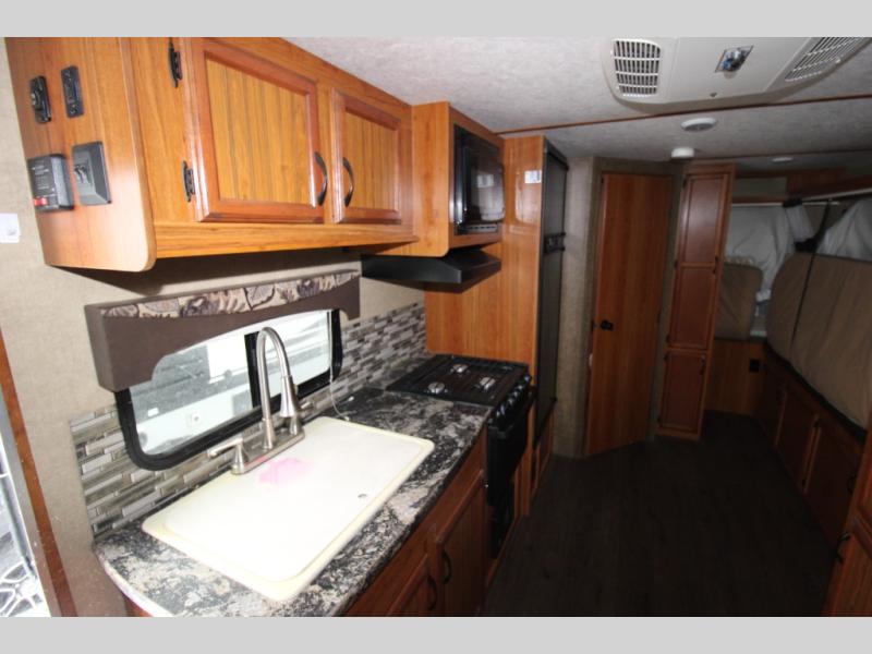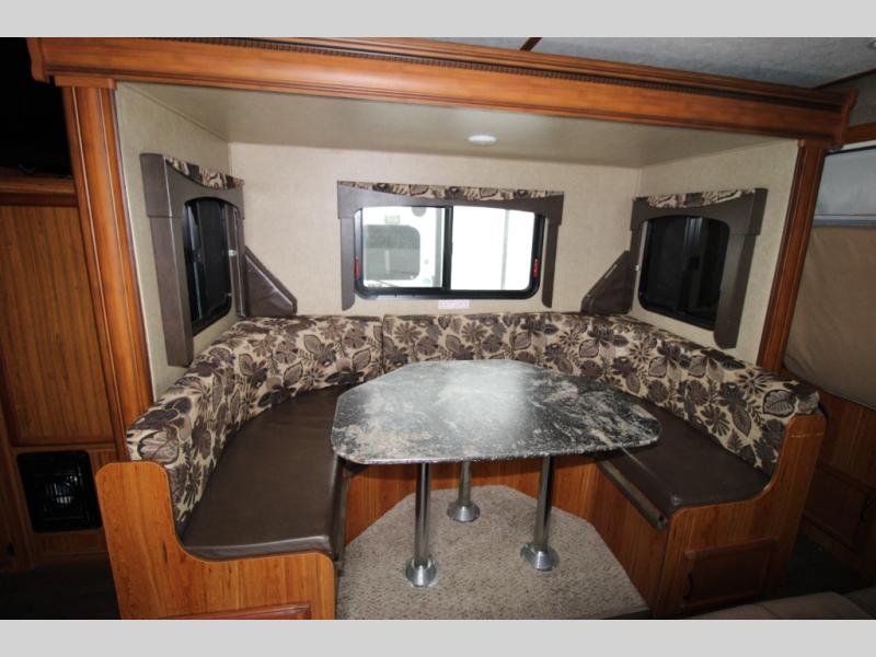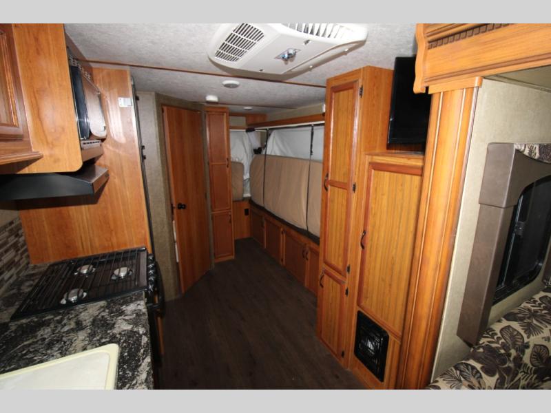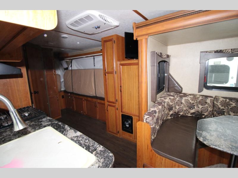 Step inside and find a sofa to your immediate right of the entry door. The front features an expandable tent end queen size bed with overhead shelf. There is also a slide out u-shaped dinette for meal times, and a wardrobe just off to the side of the slide for clothing storage. Above the wardrobe it is prepped for a TV if you choose to add.