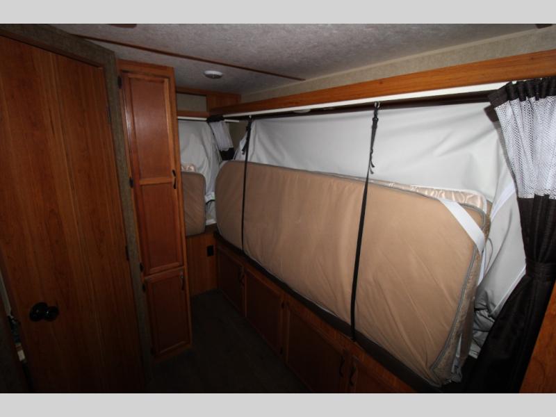 The rear and rear side also feature queen size tent end expandable beds for sleeping along with overhead cabinets above the side bed, and an overhead shelf along the back.