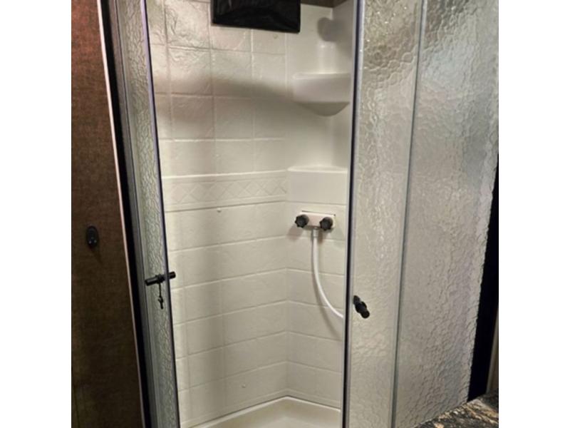 Along the rear wall enjoy two lounge chairs with an end table between and overhead storage above. Adjacent there is more seating with the sleeper sofa or optional hide-a-bed, the choice is yours. Along with the sofa in this slide you will also find some kitchen appliances like a refrigerator, pantry, and a three burner range with overhead microwave oven. You also will find additional storage in the hutch just off the slide out. The kitchen island is also quite convenient and features a double sink making food prep and cleanup simple.
