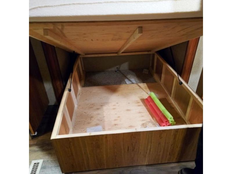 Inside the master enjoy a spacious retreat with a slide out queen bed for sleeping, a full front wall wardrobe for clothing storage and more, plus a dresser with overhead TV cabinet opposite the bed.