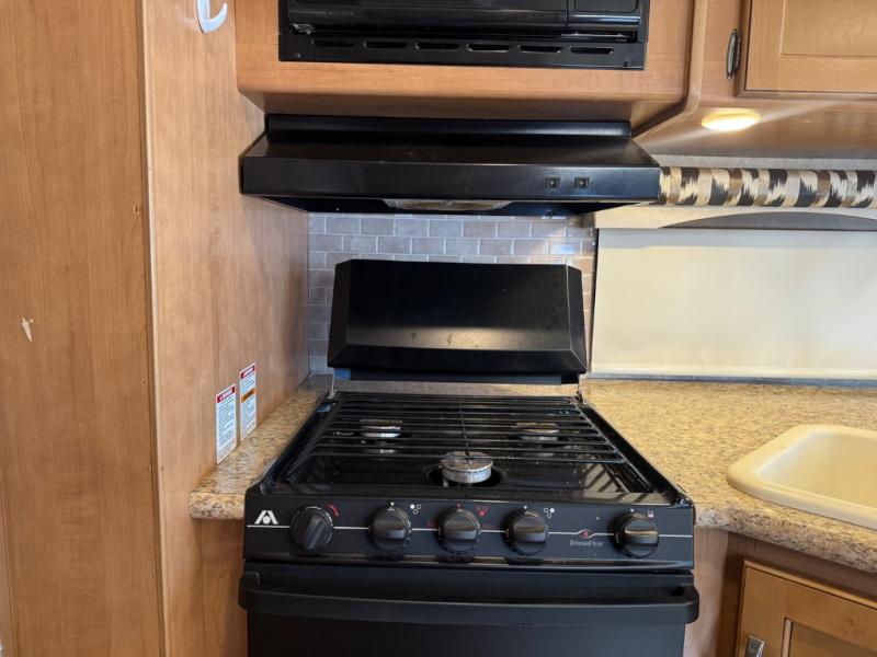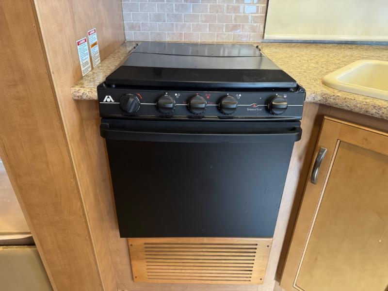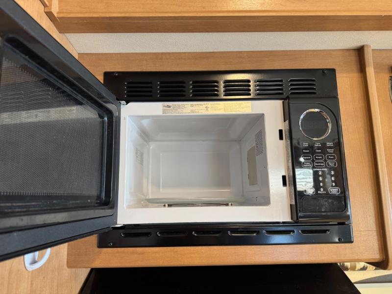 The kitchen amenities provide what you need to create meals and snacks on the go. There is a three burner range with microwave oven, a single kitchen sink, and overhead storage along with a refrigerator found on the opposite side. There is also a pull-out pantry for storage.