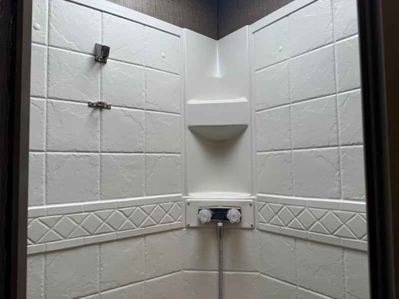 Heading toward the rear of the coach there is a full bath with angled shower, toilet and sink. The bath features dual entry doors to easily access from the living area, and from the rear bedroom too.