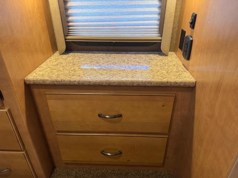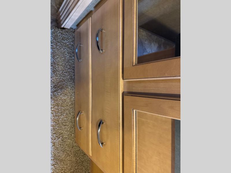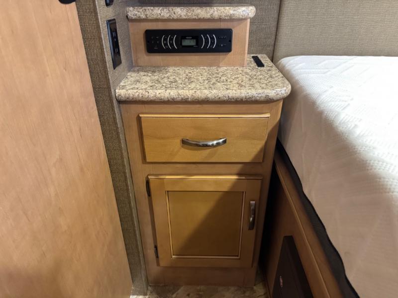 The rear bedroom features a queen bed with nightstands and overhead cabinets. There is also a closet and dresser along the full wall slide. Above the dresser you can choose to have an optional 32" LED TV.