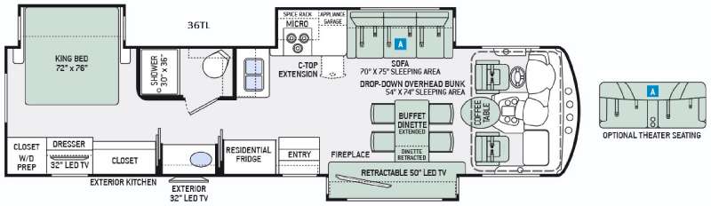 As you enter the coach you will find a slide to your right. It holds a buffet dinette with extension and four chairs, counter space with a retractable 50" LED TV, overhead cabinets, and a fireplace.
