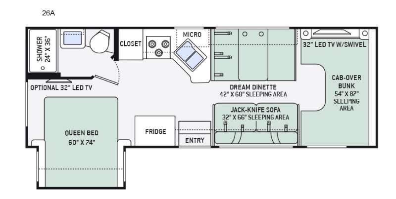 Step inside and find a 66" jackknife sofa to the right of the entry door. Across from the sofa is a booth dinette. Both sofa and dinette offer overhead storage and can each be made into additional sleeping space for the kids or extra guests.