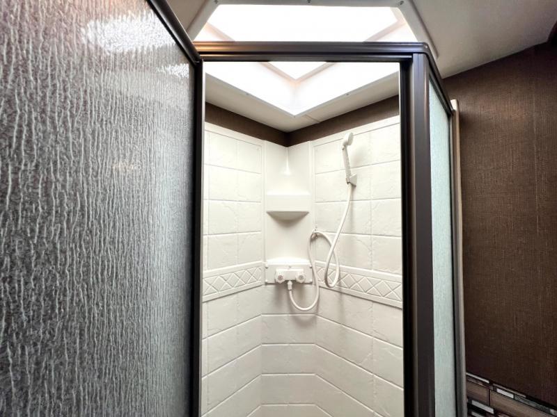 A convenient bath features an angled shower, toilet, sink, and linen cabinet. A large storage closet is located across the hall in the large slide out.